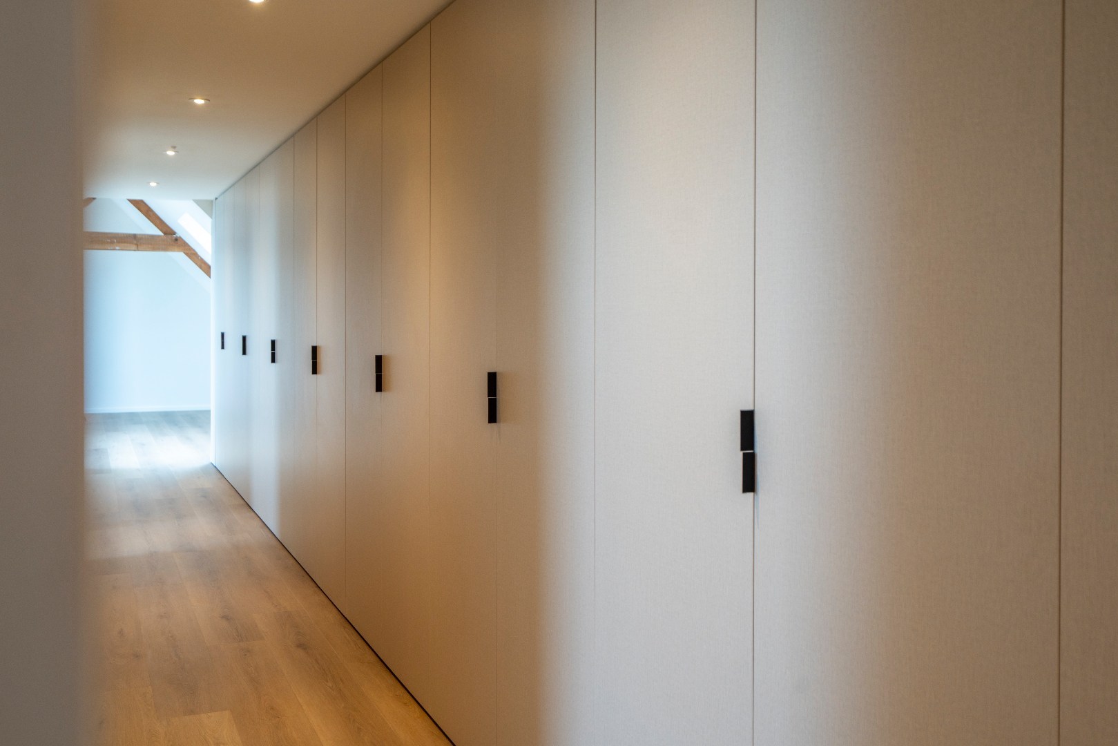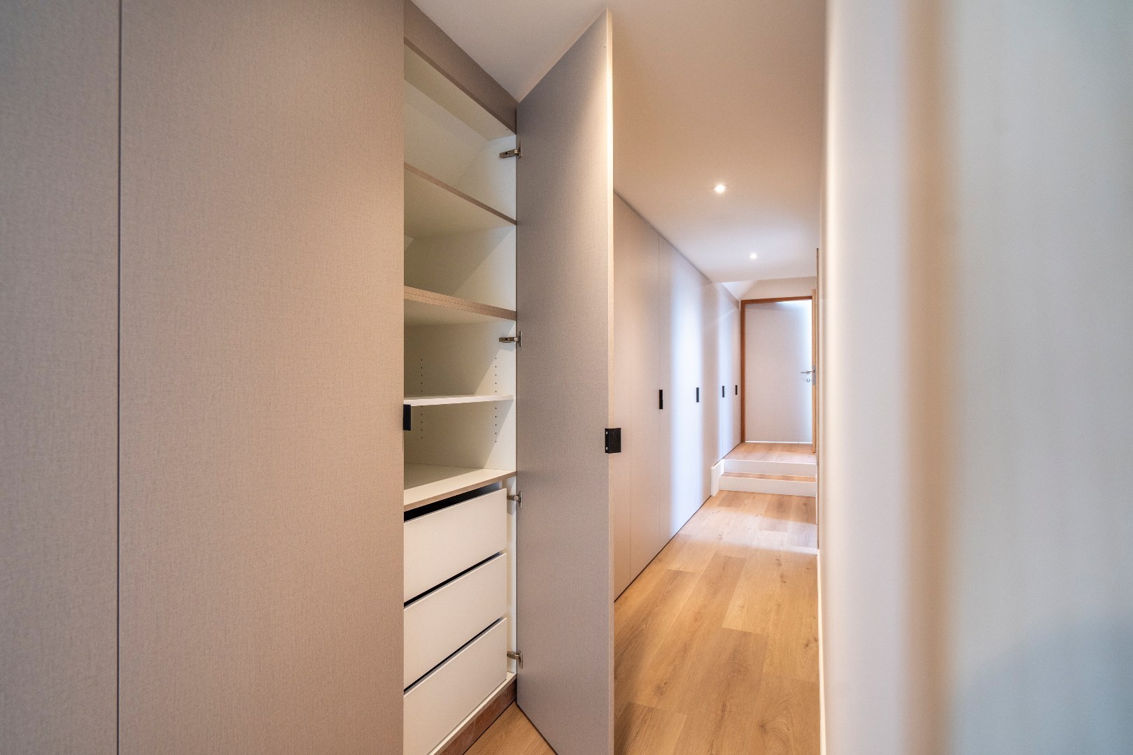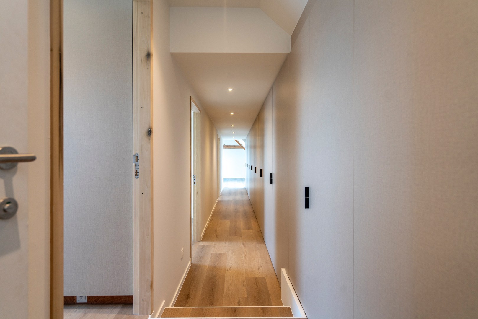 Via de private ingang met fietsbeugel in de hal leidt de trap je naar de 1ste en 2de verdieping. Daar vind je een technische berging en een open ruimte. De lange hall vormt de ruggengraat van de loft: links toegang tot alle vertrekken, rechts een volledige wand maatwerkkasten van Kaster, met hang- en leggedeeltes en binnenlades. Een parel van functionaliteit, walk-in wardrobe plus.