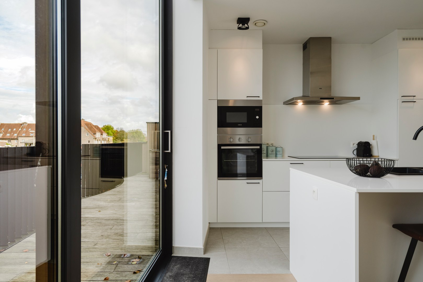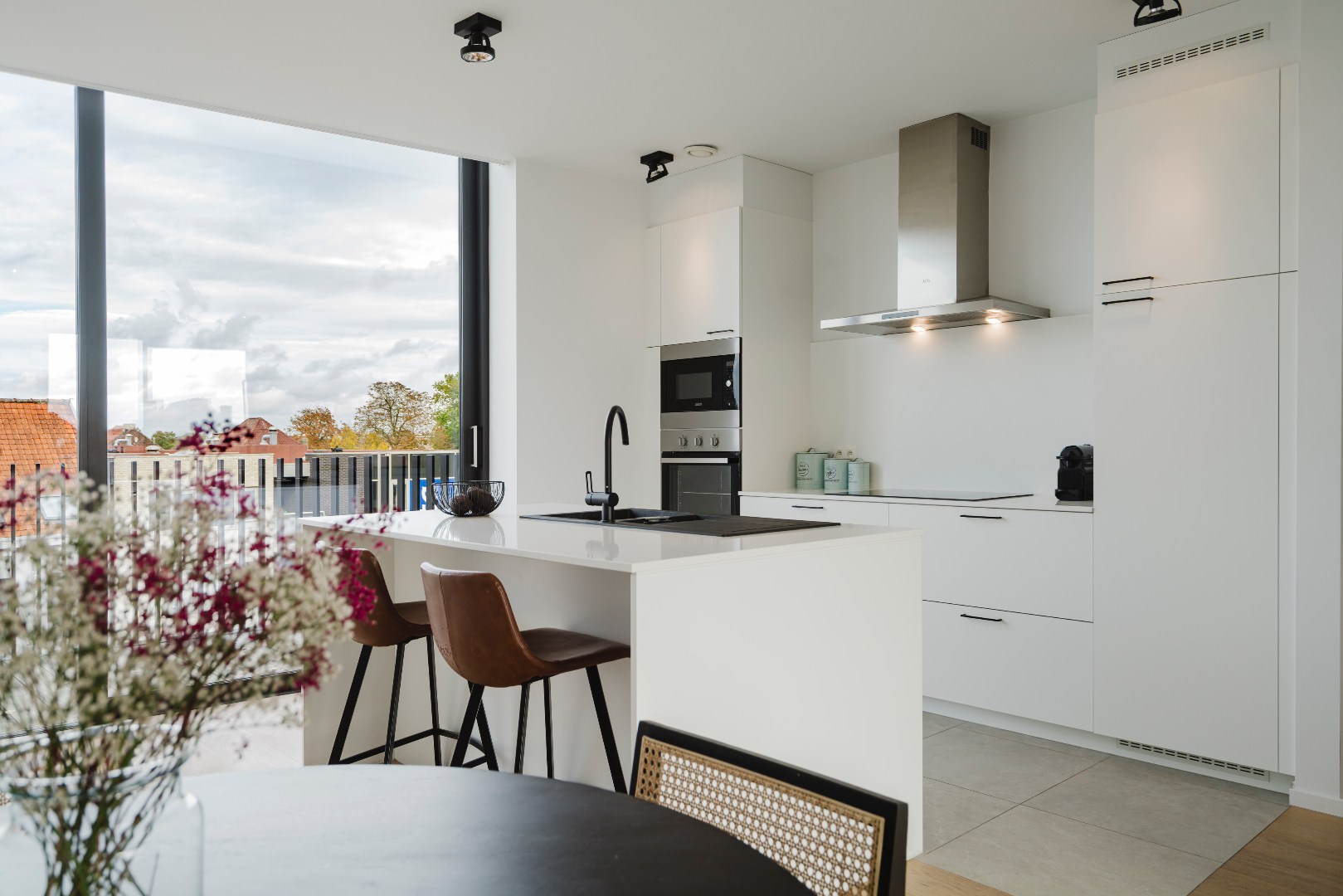 De leefruimte met open keuken en stijlvol keukeneiland vormt het hart van dit appartement. De keuken is voorzien van al het nodige & biedt je gasten ook ruimte om reeds te genieten van een apero tijdens je kookkunsten. Gordijnen en lichtarmaturen zijn reeds voorzien, waardoor het appartement meteen gebruiksklaar is.