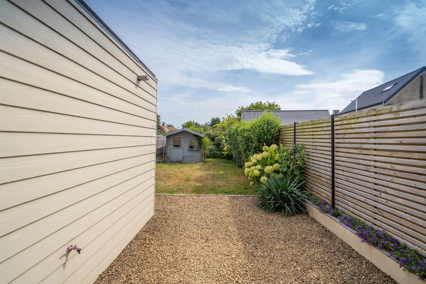 Een groot schuifraam opent naar het terras en de tuin, waar een tuinhuis met tuingerief ter beschikking staat.