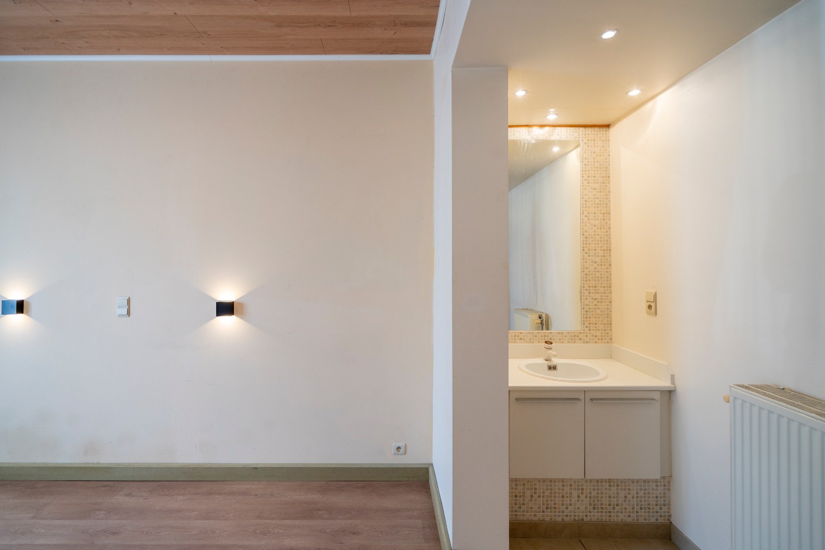 Via de inkomhal betreed je het appartement. Rechts is plaats voor 1 fiets. Vooraan bevindt zich de slaapkamer met annex wastafel. Aansluitend ligt de badkamer, uitgerust met douche, toilet en lavabomeubel. Een technische berging met aansluitingen voor wasmachine en droogkast ligt tussen badkamer en leefruimte.