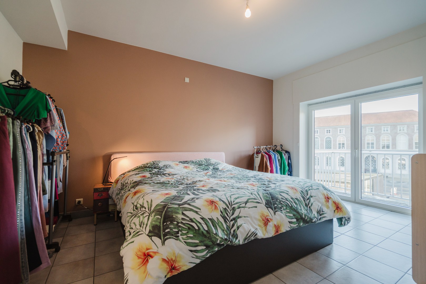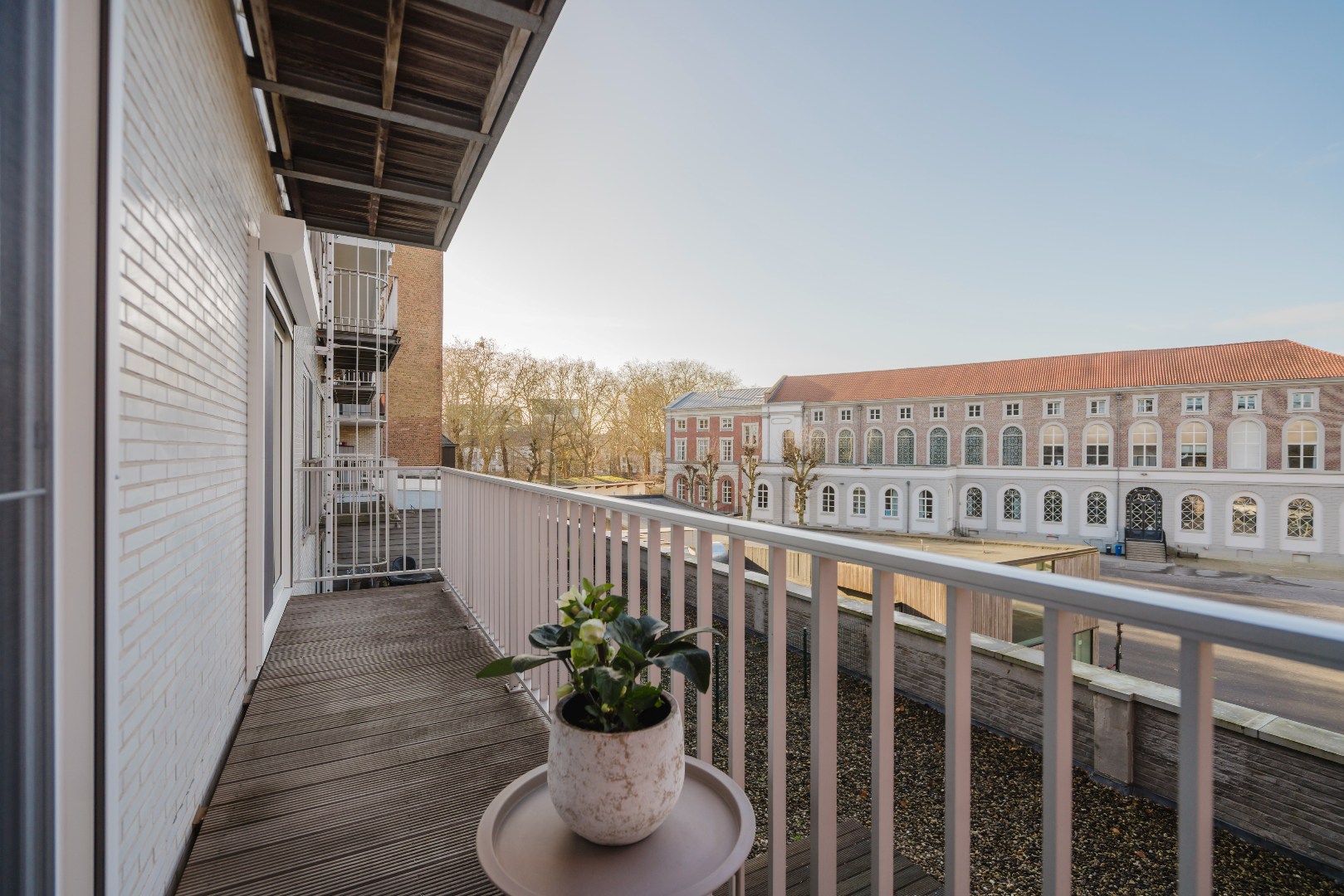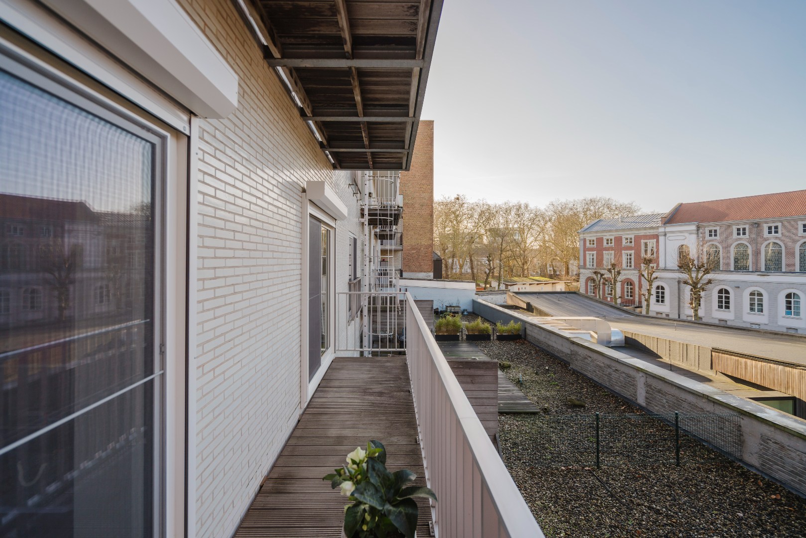 Aan de achterzijde van het appartement bevinden zich twee bijzonder ruime slaapkamers. Beide kamers geven rechtstreeks toegang tot het terras en bieden een open en rustgevend uitzicht op de gerenoveerde gebouwen van het Guldensporencollege. Daarnaast beschikt het appartement over een moderne badkamer met een stijlvolle inloopdouche en twee praktische bergingen, waarvan één is ingericht als wasberging.