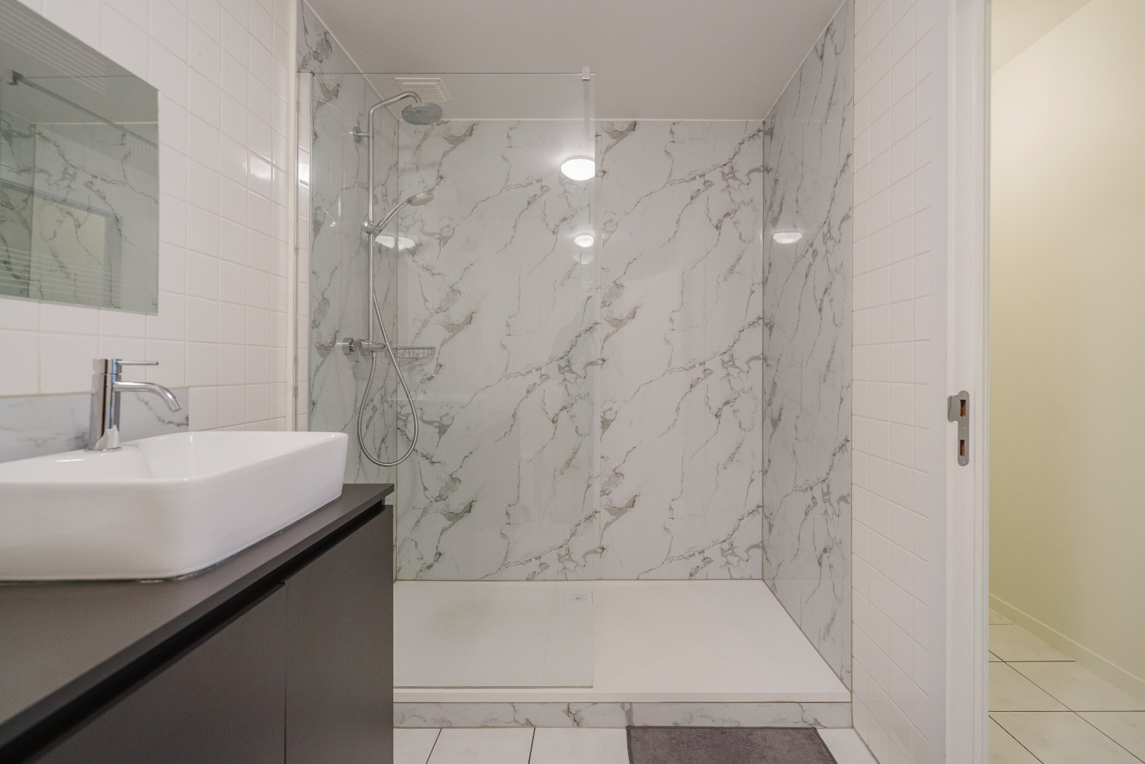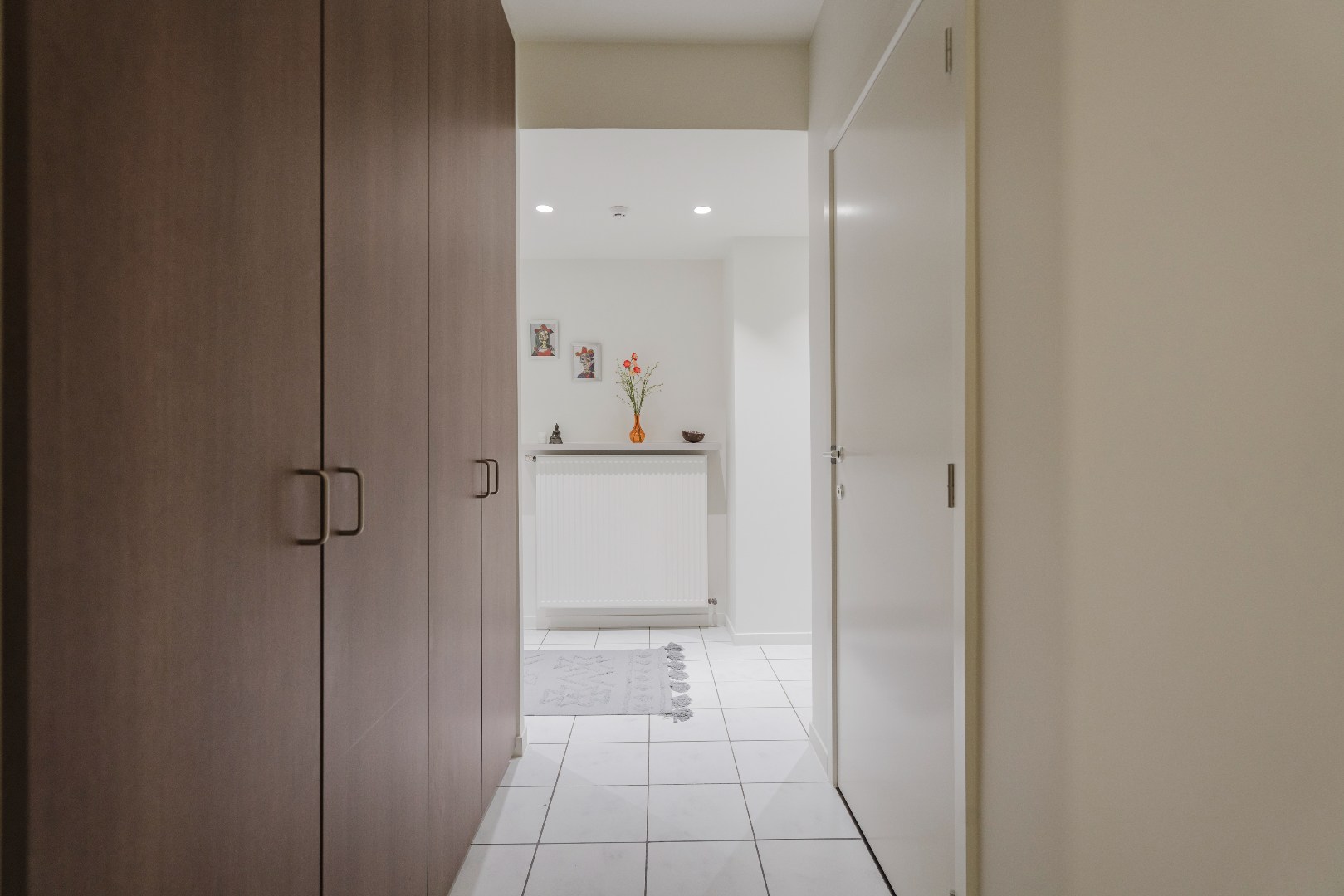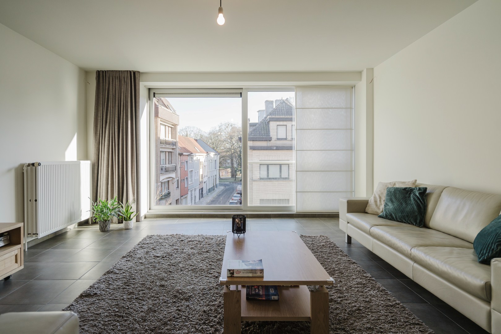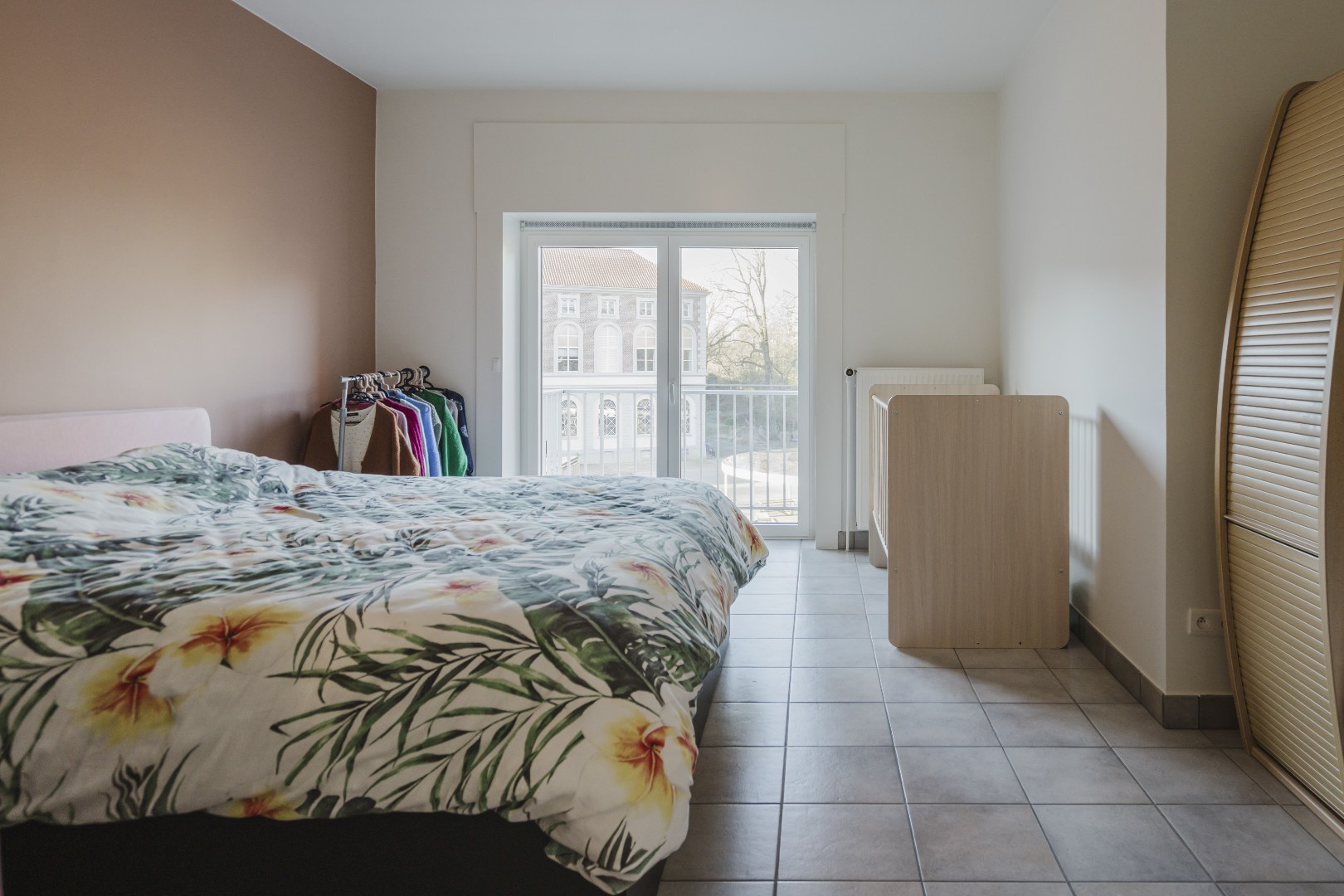 Aan de achterzijde van het appartement bevinden zich twee bijzonder ruime slaapkamers. Beide kamers geven rechtstreeks toegang tot het terras en bieden een open en rustgevend uitzicht op de gerenoveerde gebouwen van het Guldensporencollege. Daarnaast beschikt het appartement over een moderne badkamer met een stijlvolle inloopdouche en twee praktische bergingen, waarvan één is ingericht als wasberging.