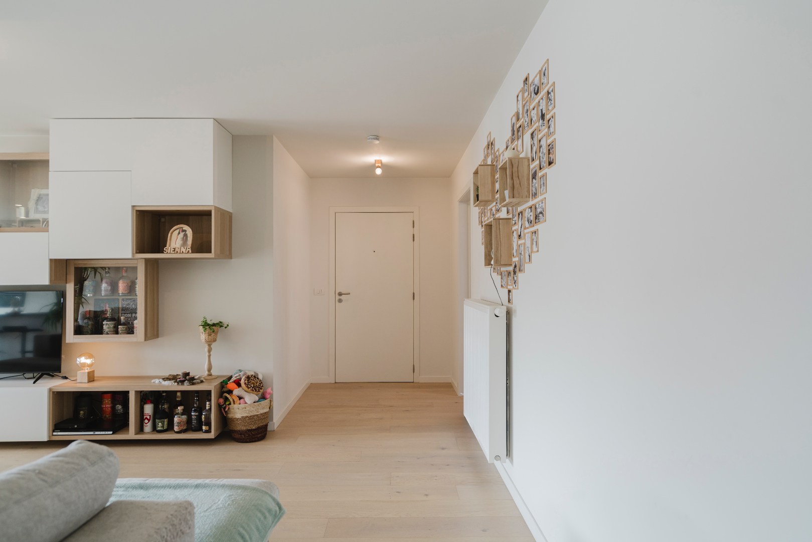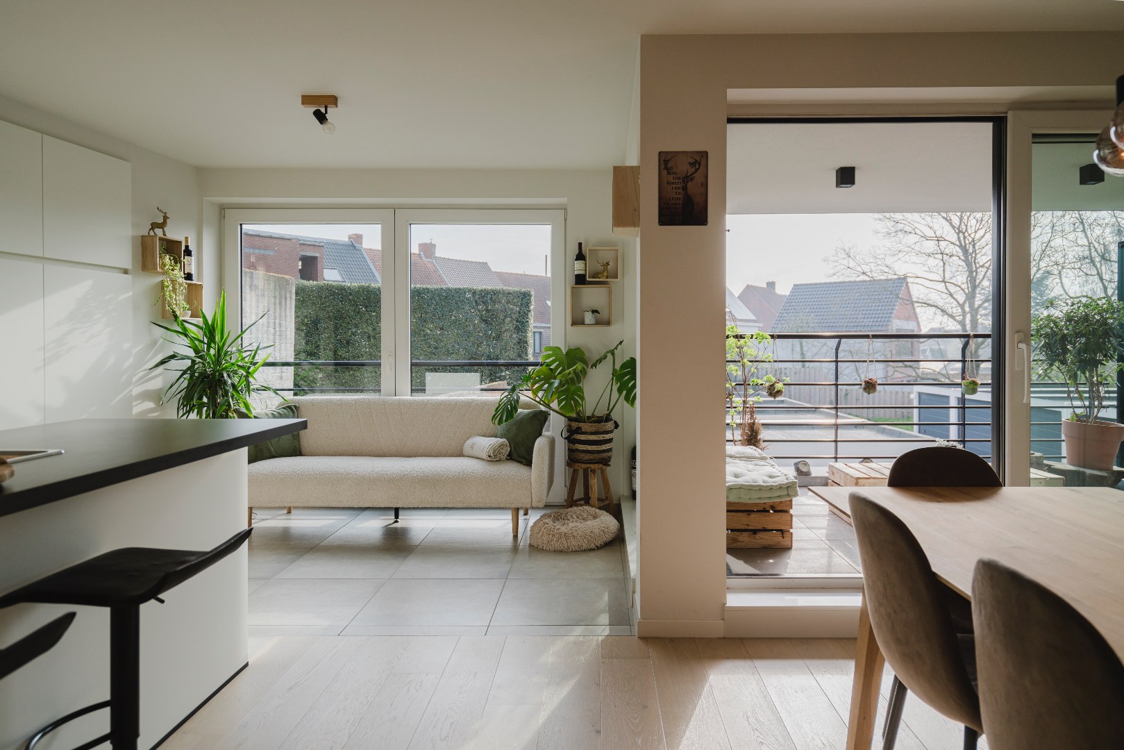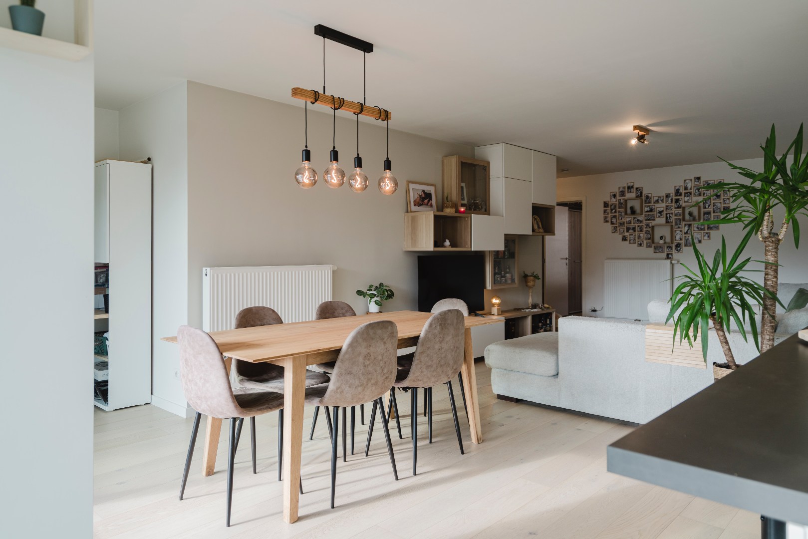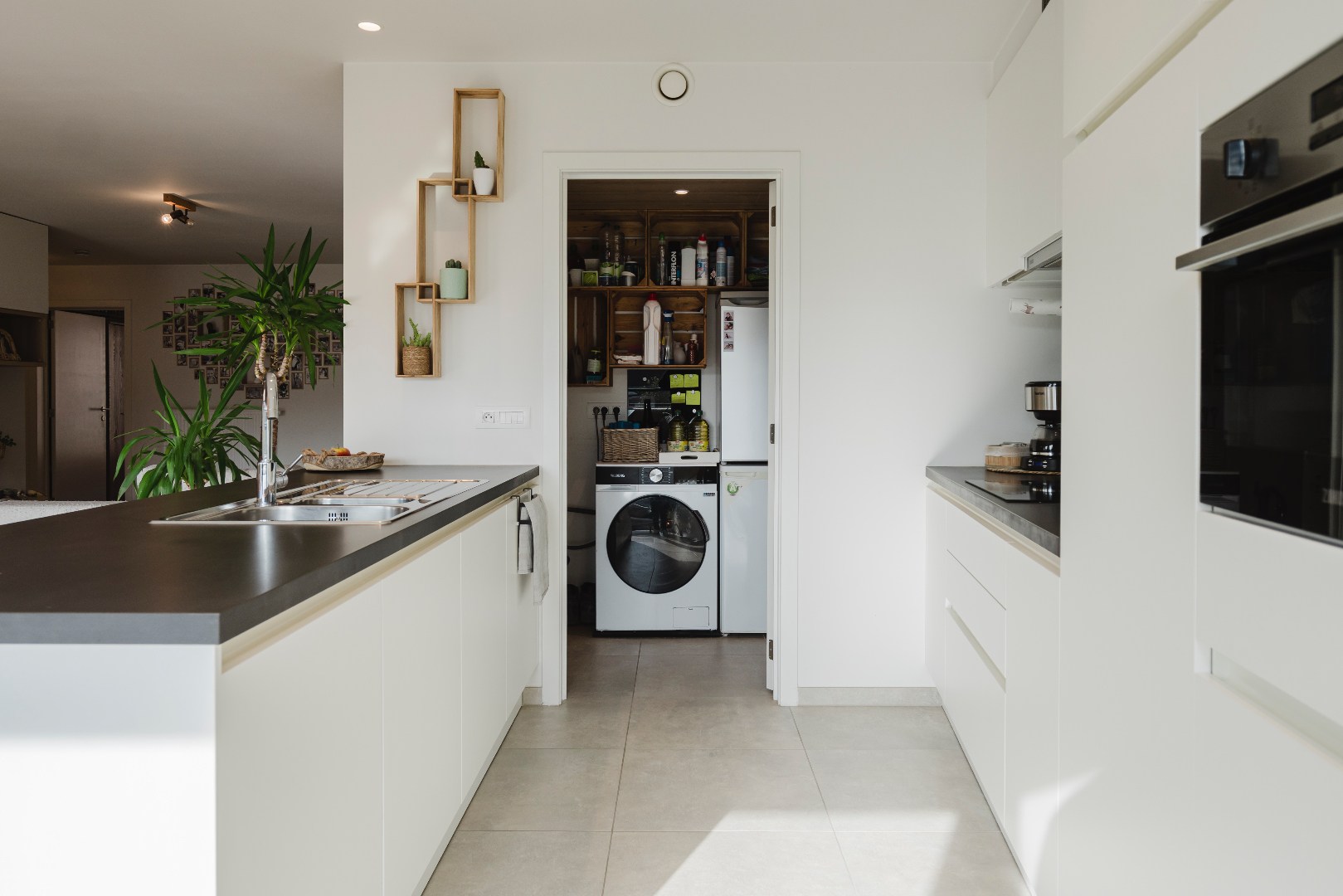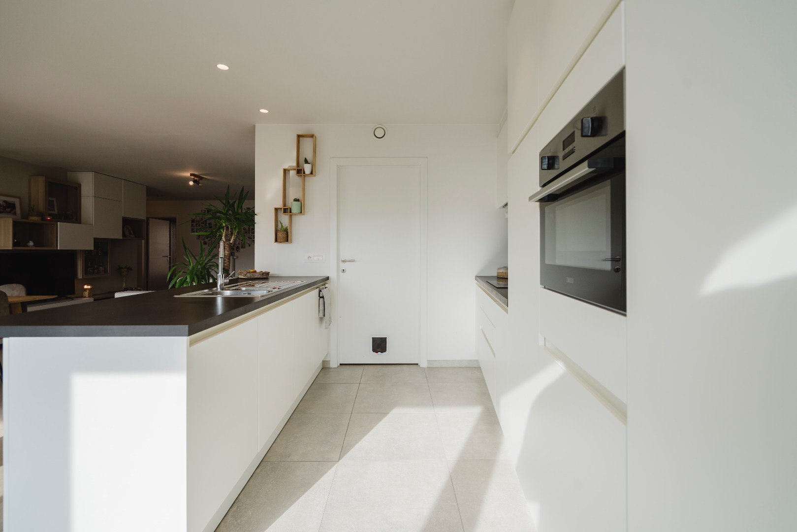 De lichtrijke leefruimte met warm parket biedt een aangename woonbeleving en beschikt over een handig bureelhoekje met zicht op het terras. Aansluitend vind je een superpraktische, volledig uitgeruste keuken met aanpalende berging en gezellige chill-zone.