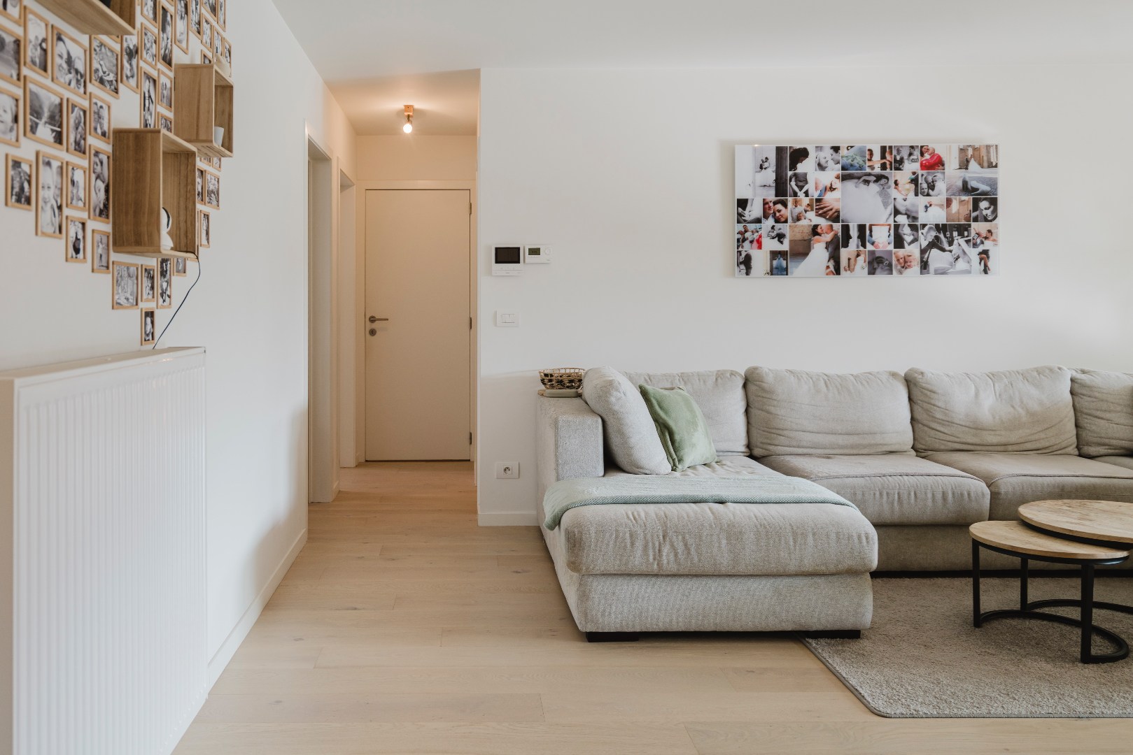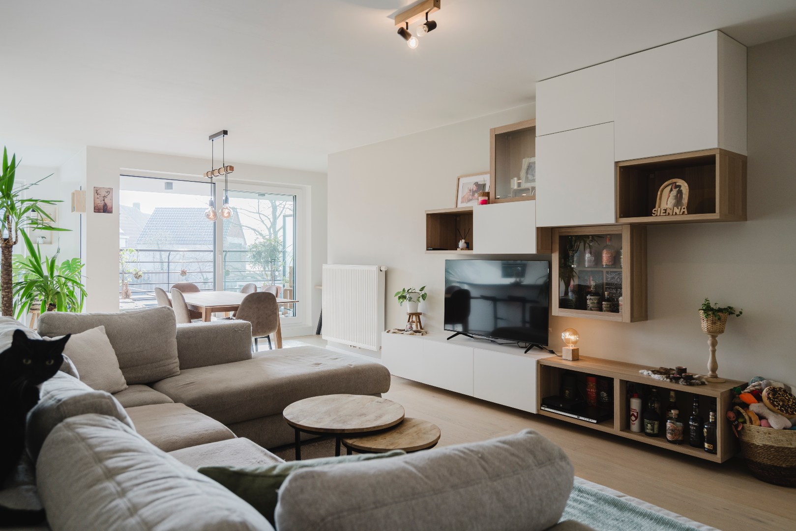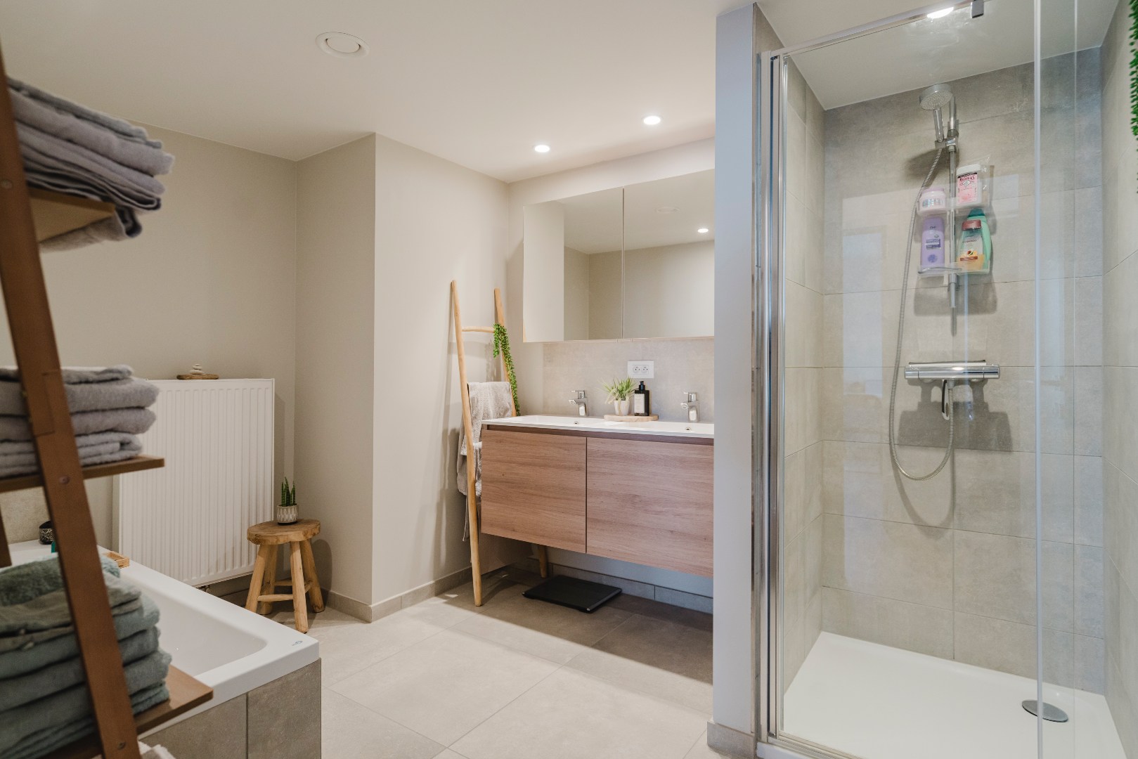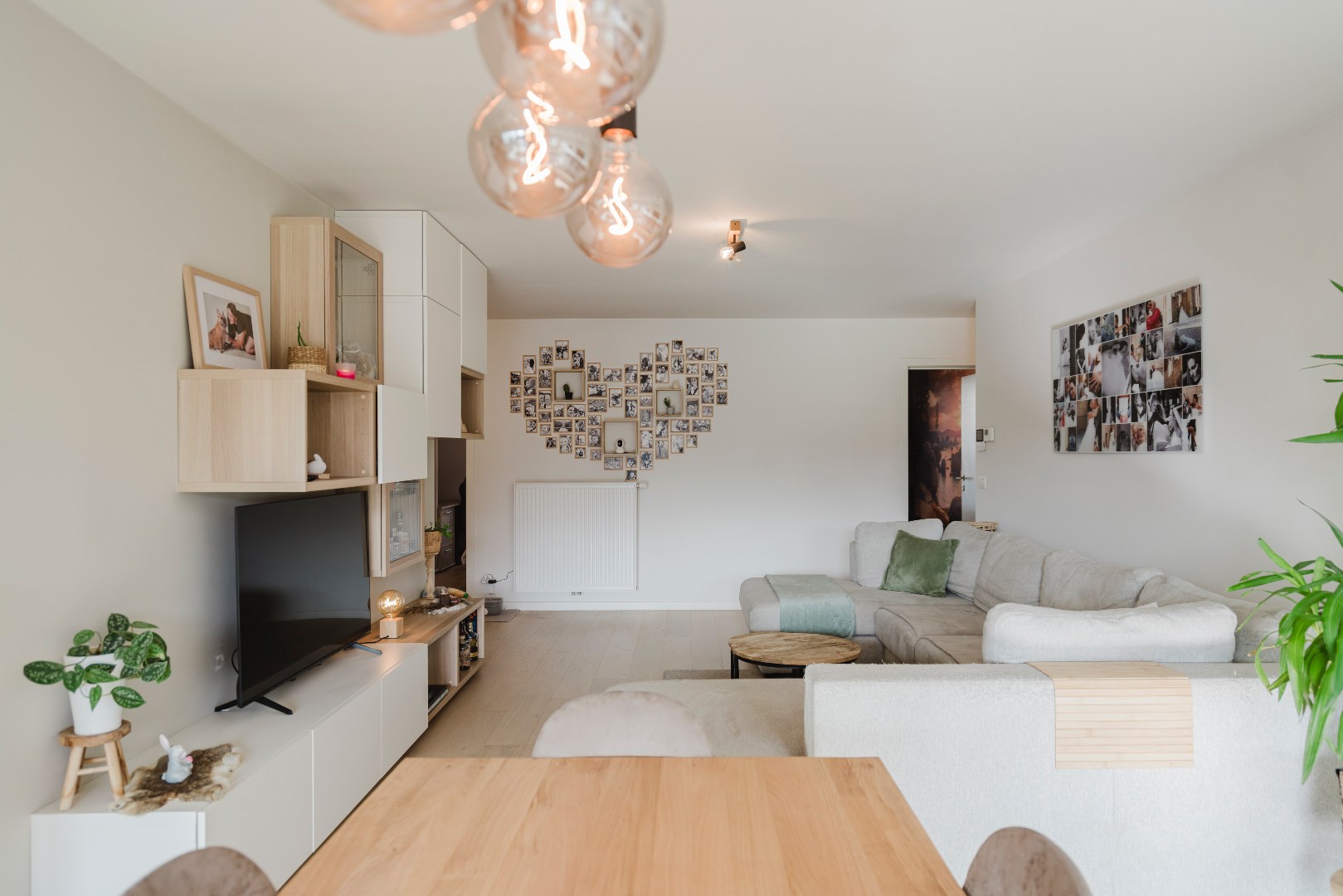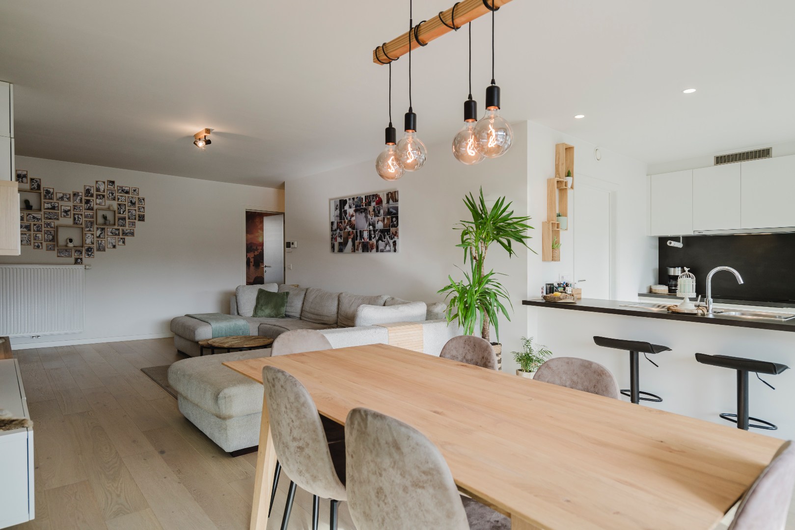 De lichtrijke leefruimte met warm parket biedt een aangename woonbeleving en beschikt over een handig bureelhoekje met zicht op het terras. Aansluitend vind je een superpraktische, volledig uitgeruste keuken met aanpalende berging en gezellige chill-zone.