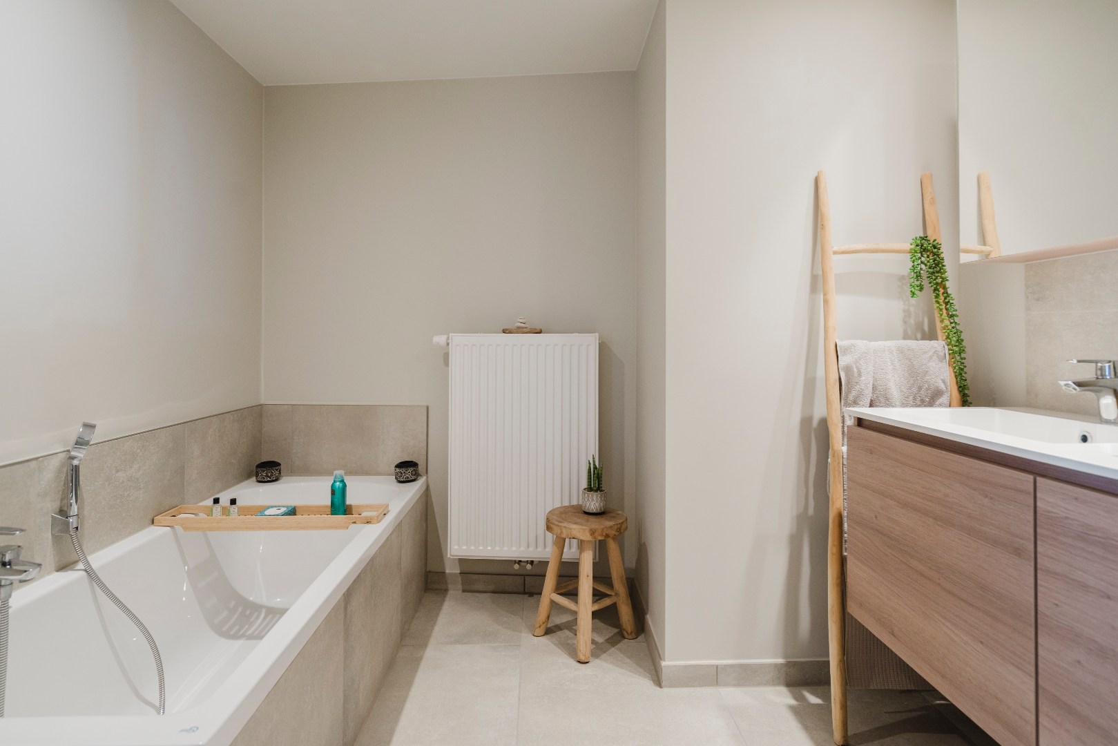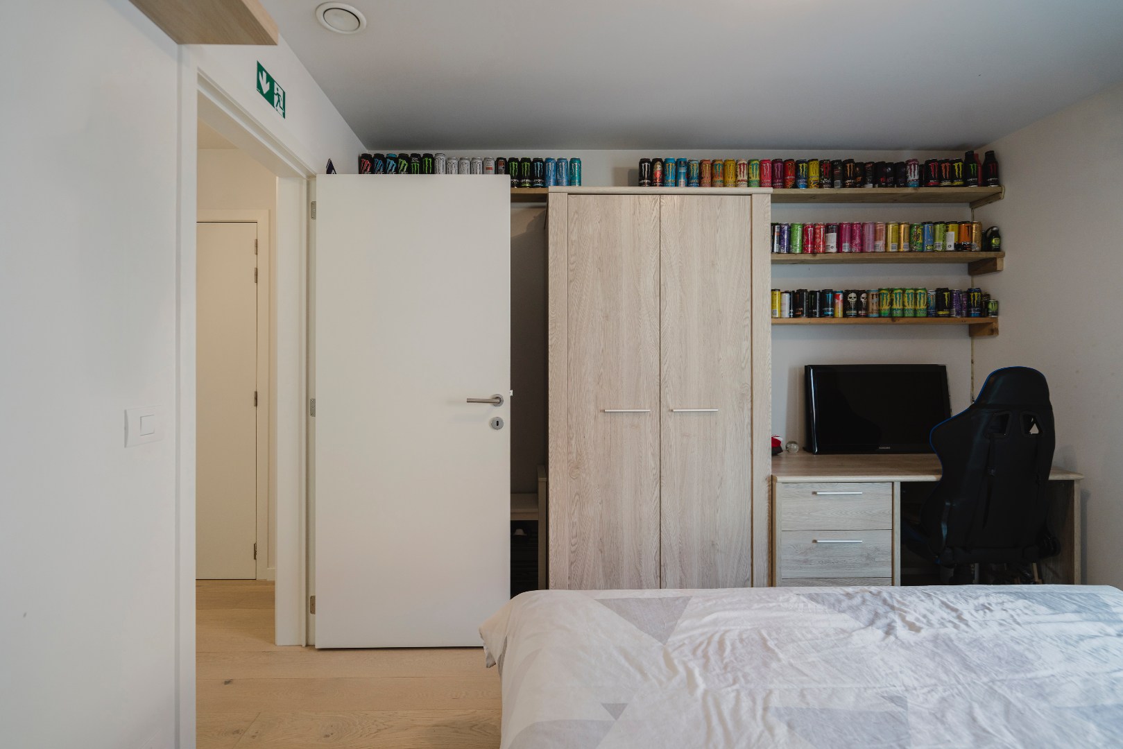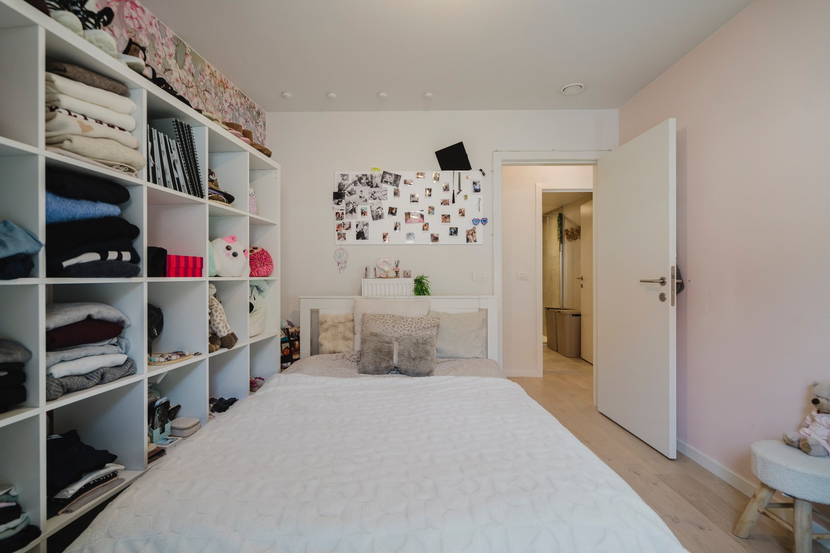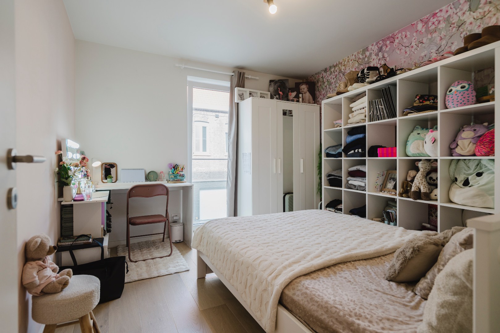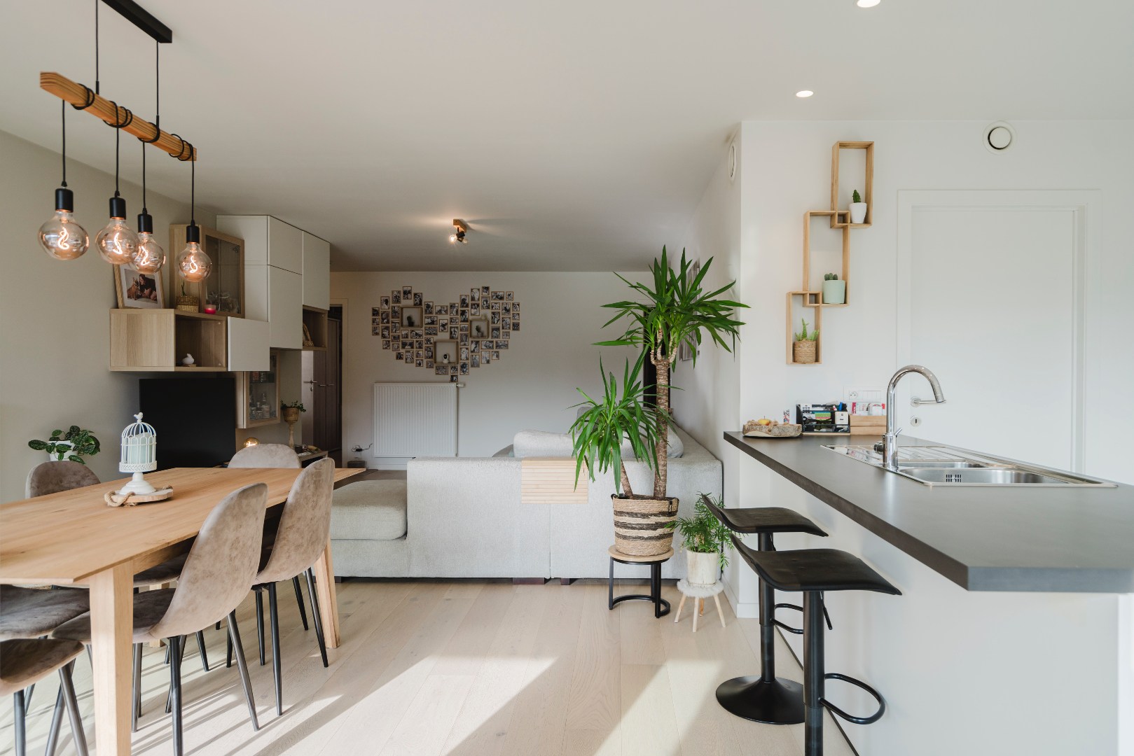 De lichtrijke leefruimte met warm parket biedt een aangename woonbeleving en beschikt over een handig bureelhoekje met zicht op het terras. Aansluitend vind je een superpraktische, volledig uitgeruste keuken met aanpalende berging en gezellige chill-zone.