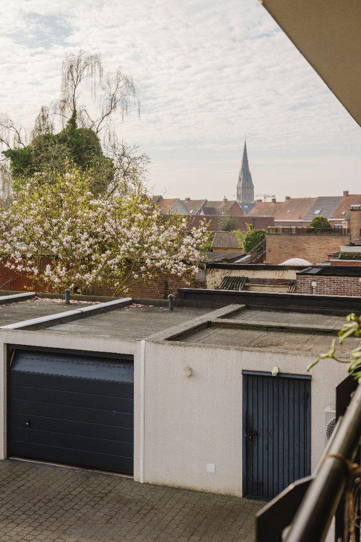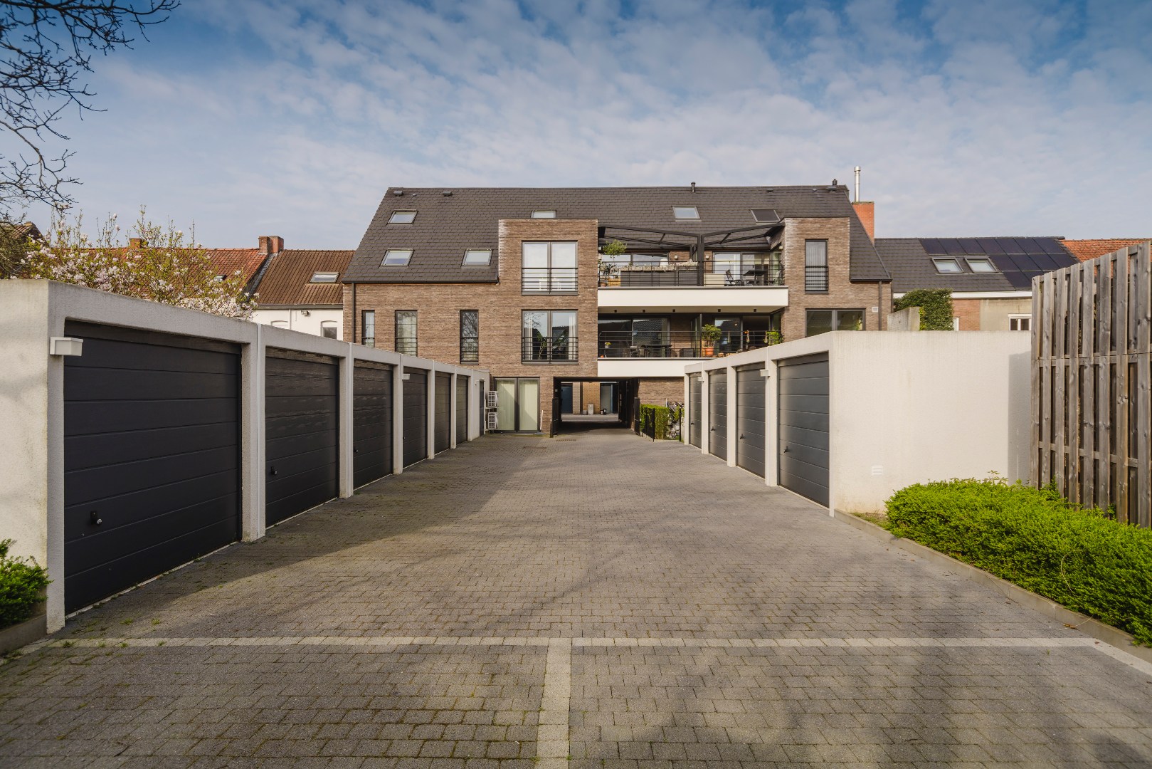 Achteraan het gebouw bevindt zich een afgesloten garagebox met elektrische poort, die mee te koop wordt aangeboden voor €25.000 (niet afzonderlijk te koop), evenals een plaats in de gemeenschappelijke, afgesloten fietsberging.