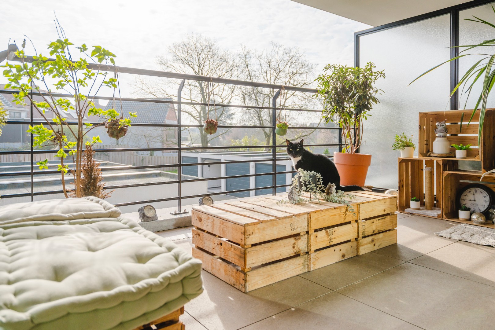 Het overkapte terras met schuifraam is zuid-oost georiënteerd en bevindt zich aan de rustige achterzijde van het gebouw.