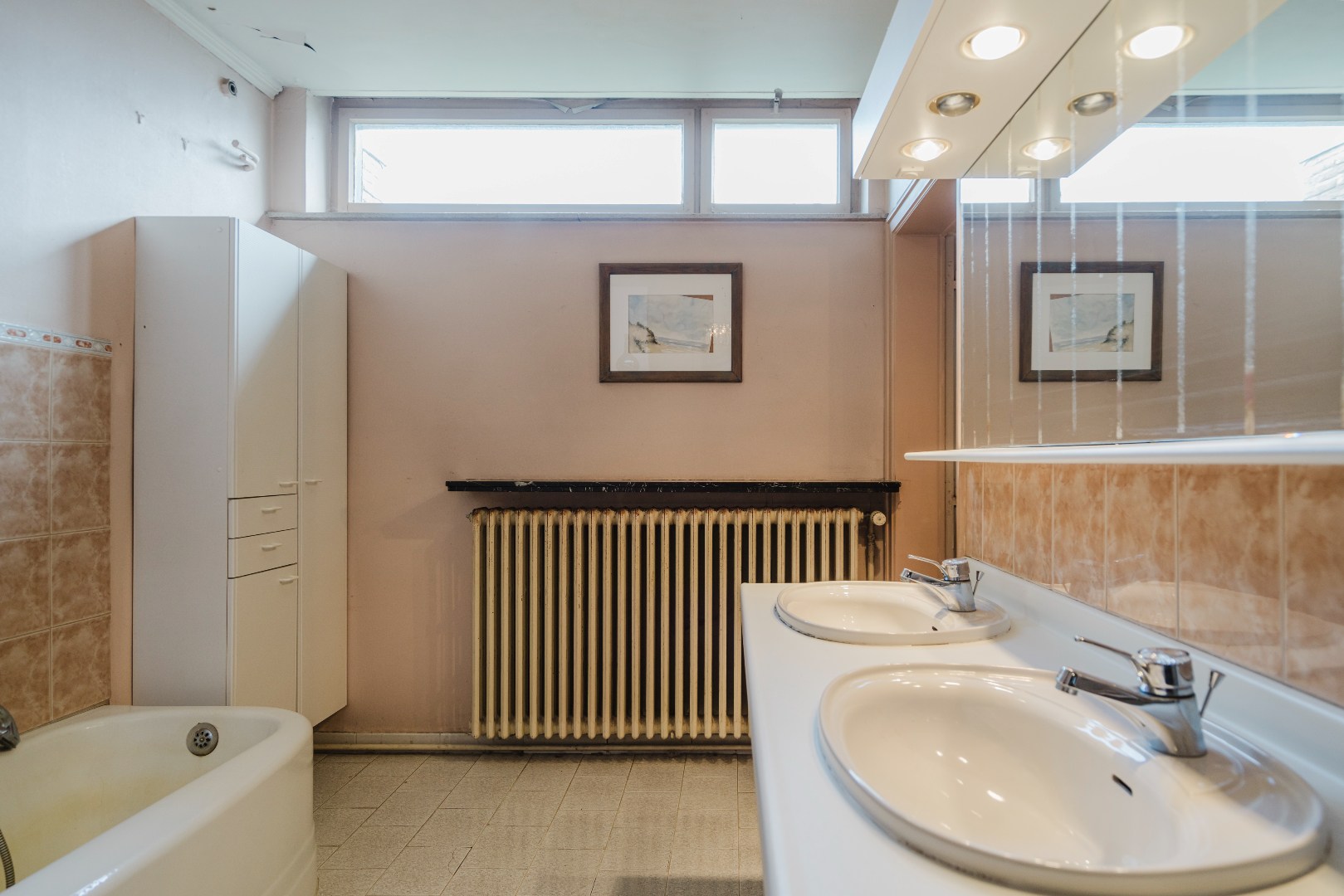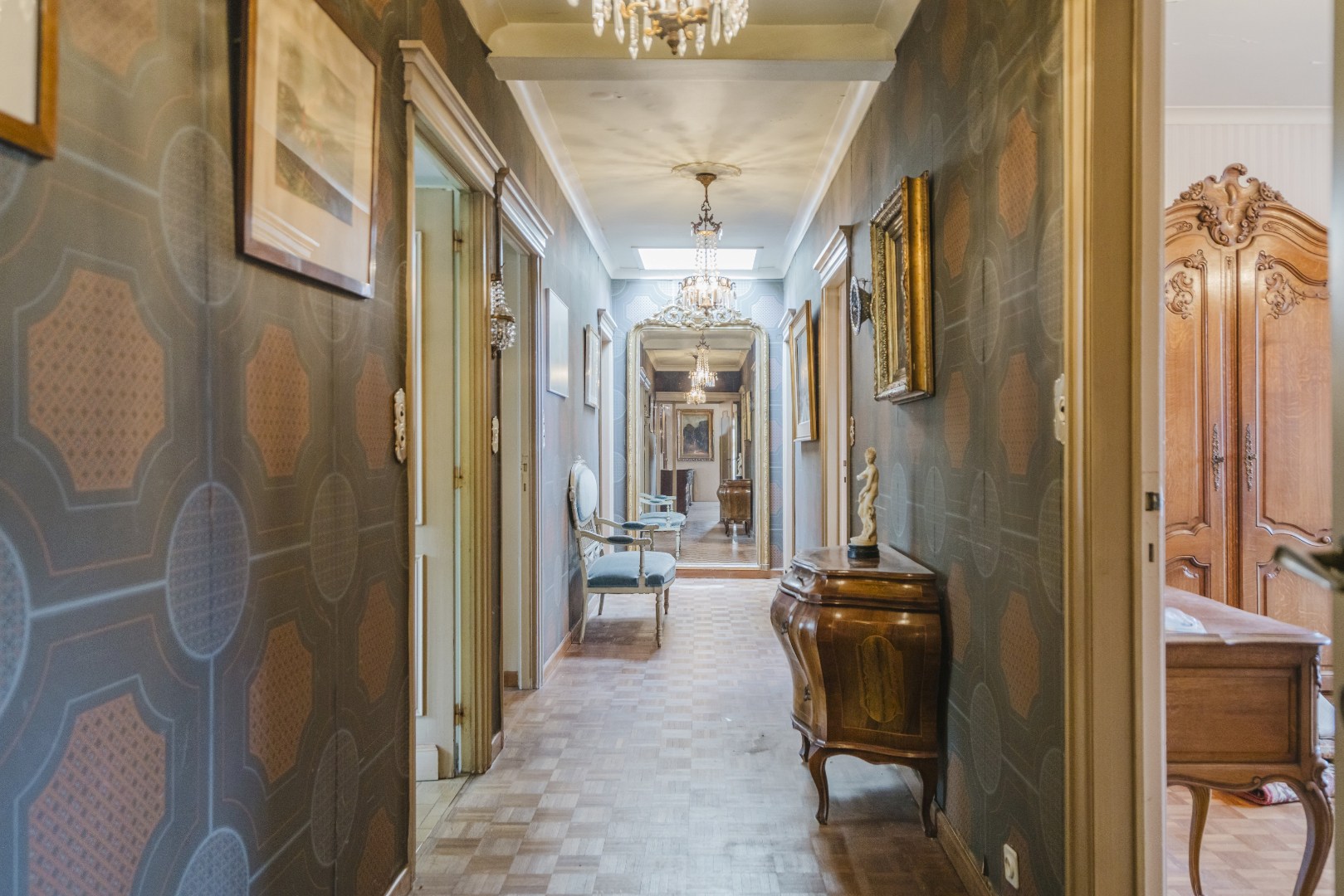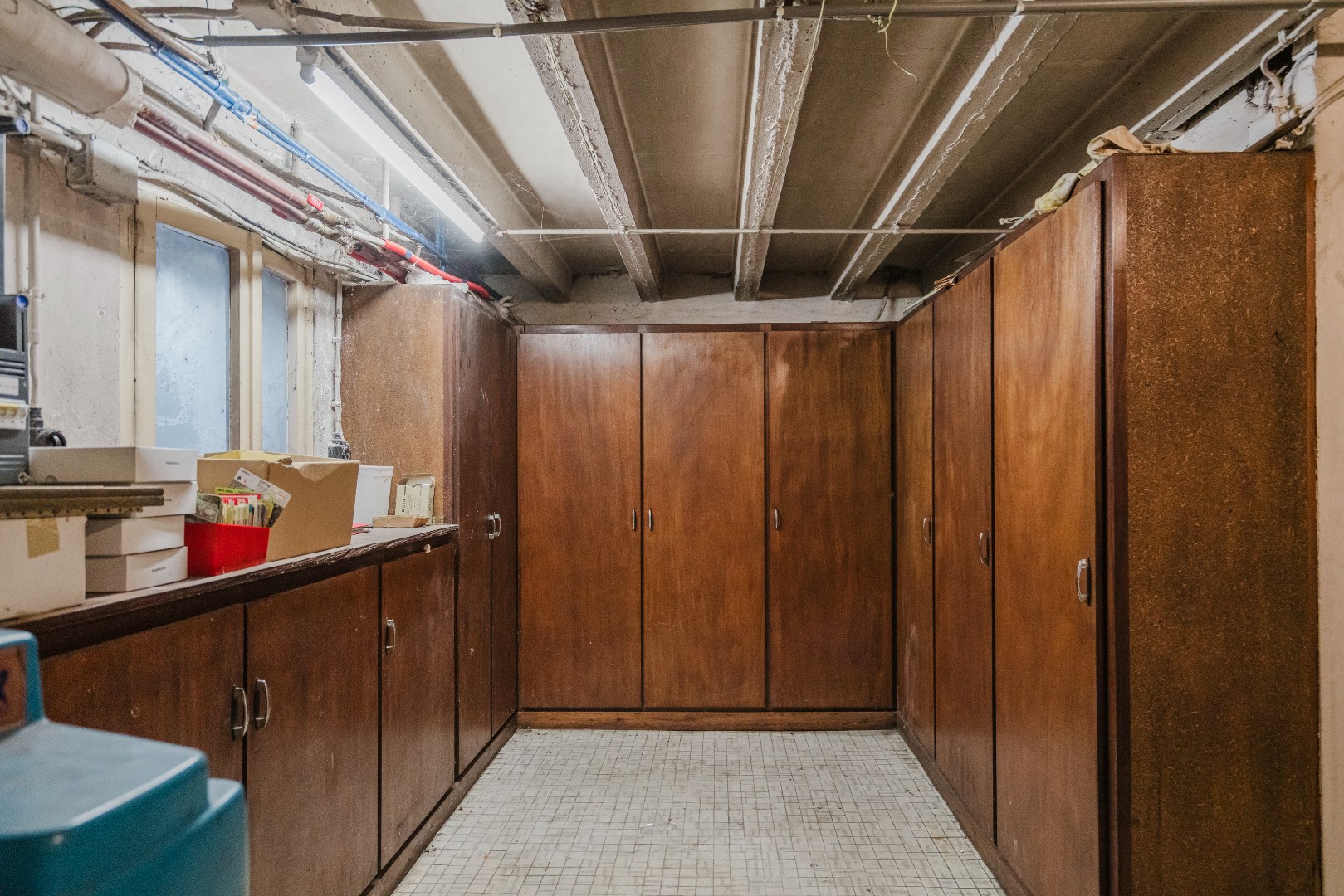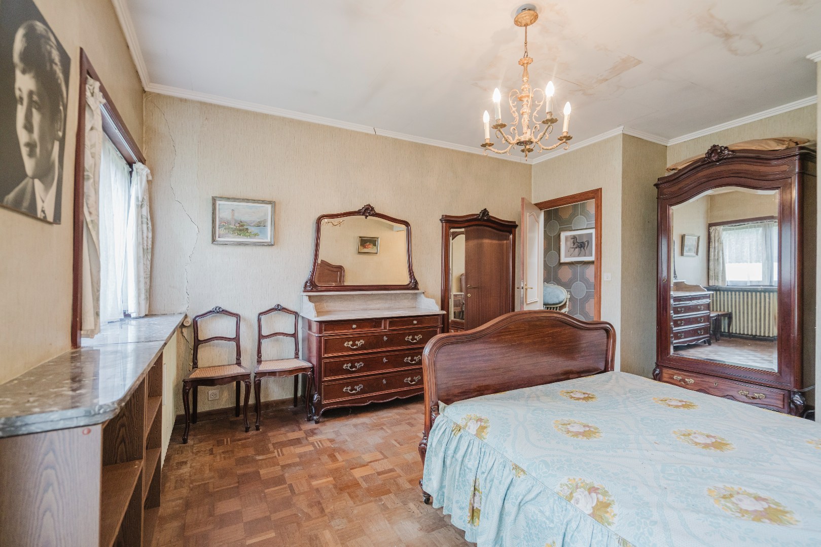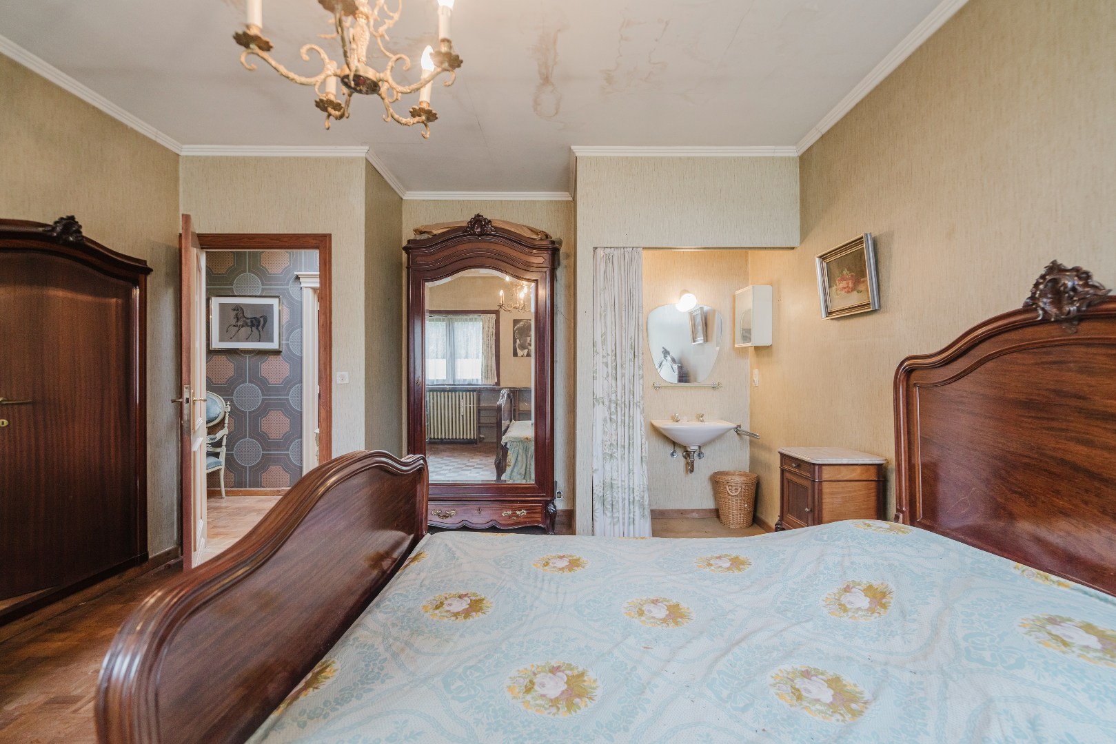 Via een sierlijke hal bereikt u de vijf volwaardige slaapkamers, waarvan twee voorzien zijn van ingemaakte kasten, evenals de badkamer. Daarnaast beschikt de woning over een uitzonderlijk ruime kelder van maar liefst 60 m², ideaal als opslagruimte.