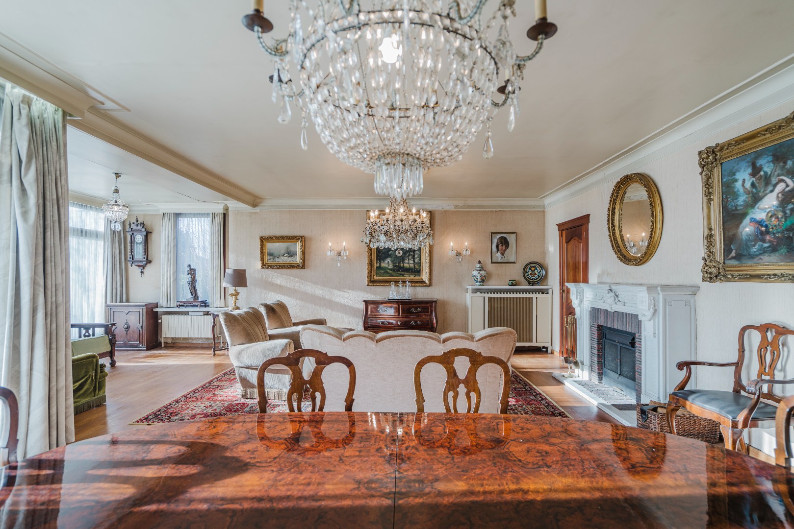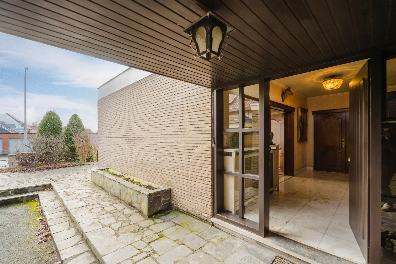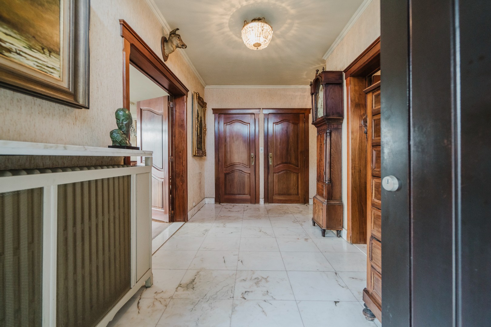De ruime inkomhal met elegante marmeren vloeren en gastentoilet zet meteen de toon en leidt naar een zeer lichtrijke woonkamer. Grote raampartijen, een marmeren schouw en toegang tot het terras en de voortuin zorgen voor een warme en aangename sfeer.