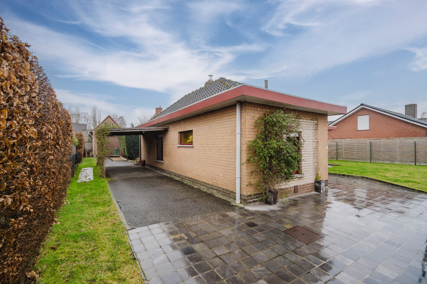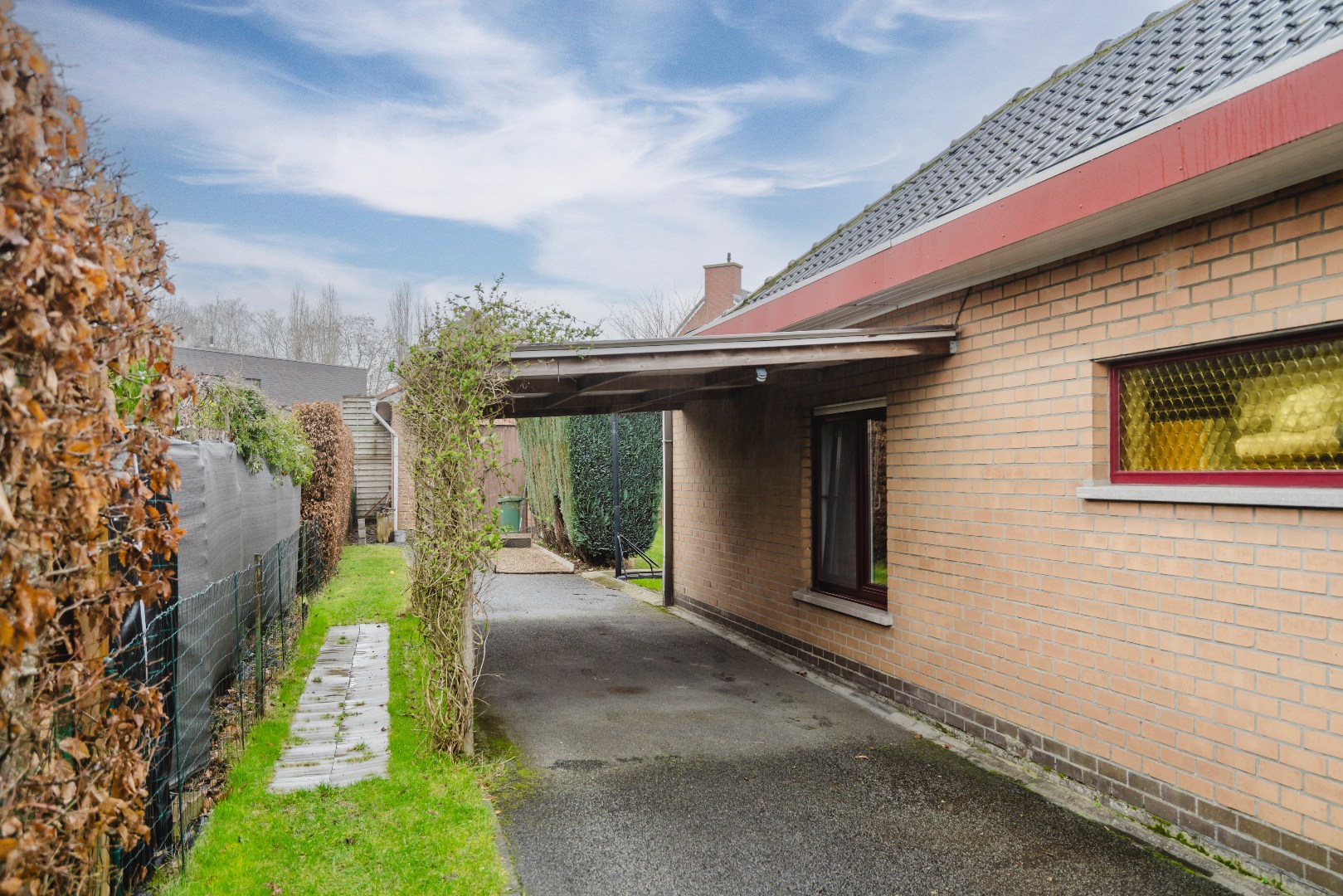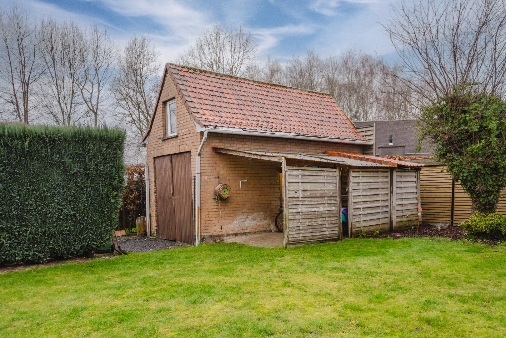 De woning beschikt ook over een garage/opslag, carport, fietsberging en houtopslag & een afgeschermde jacuzzi. De oorsponkelijk inpandige garage werd opgevormd tot een extra slaapkamer en bergruimte.