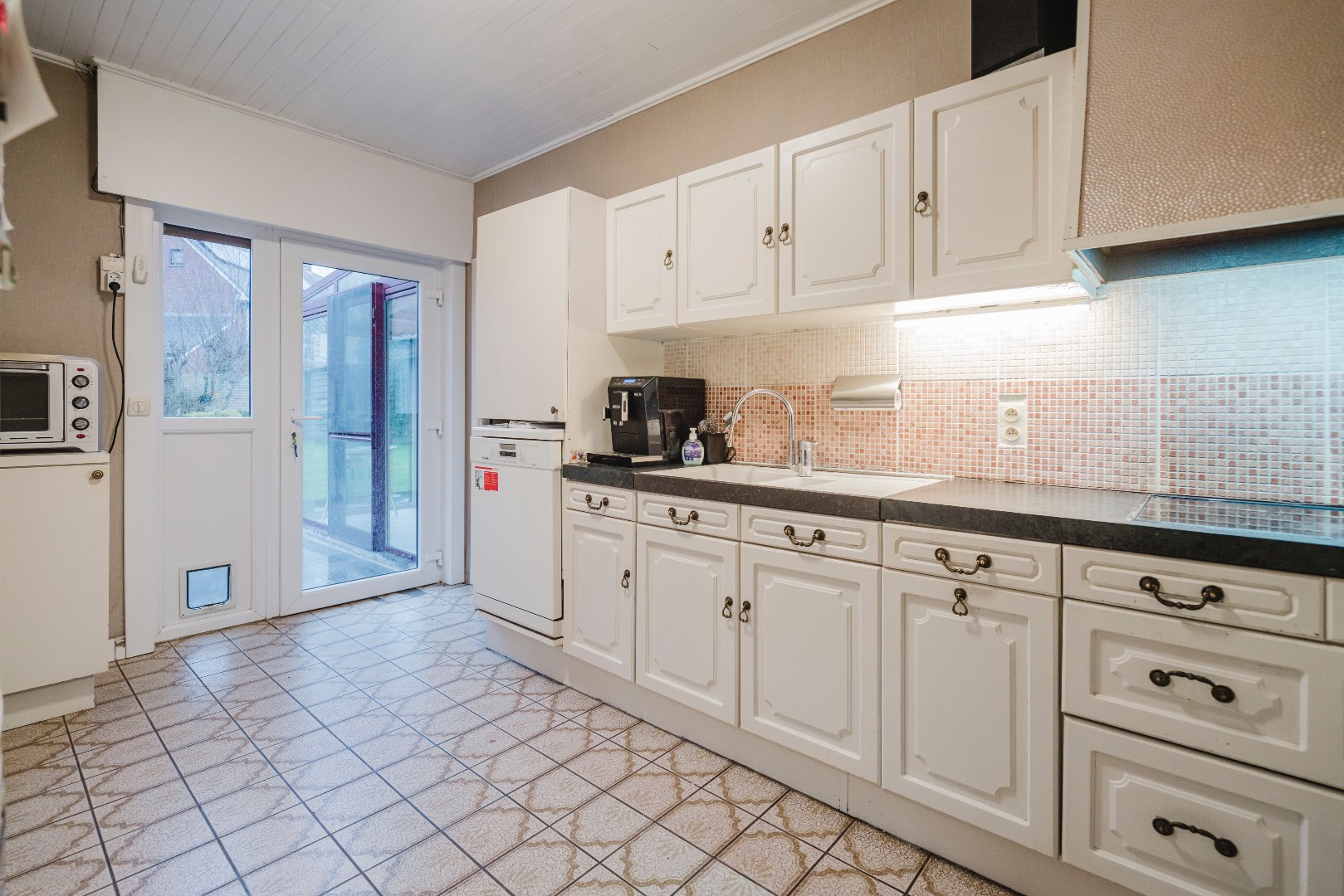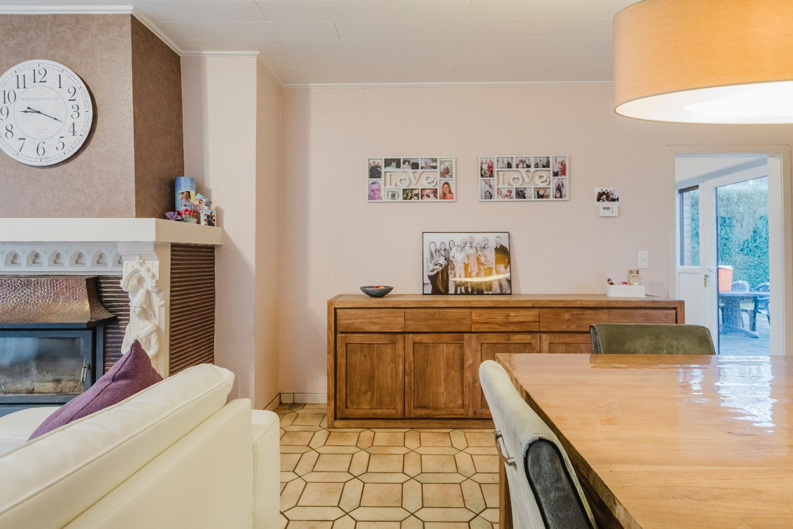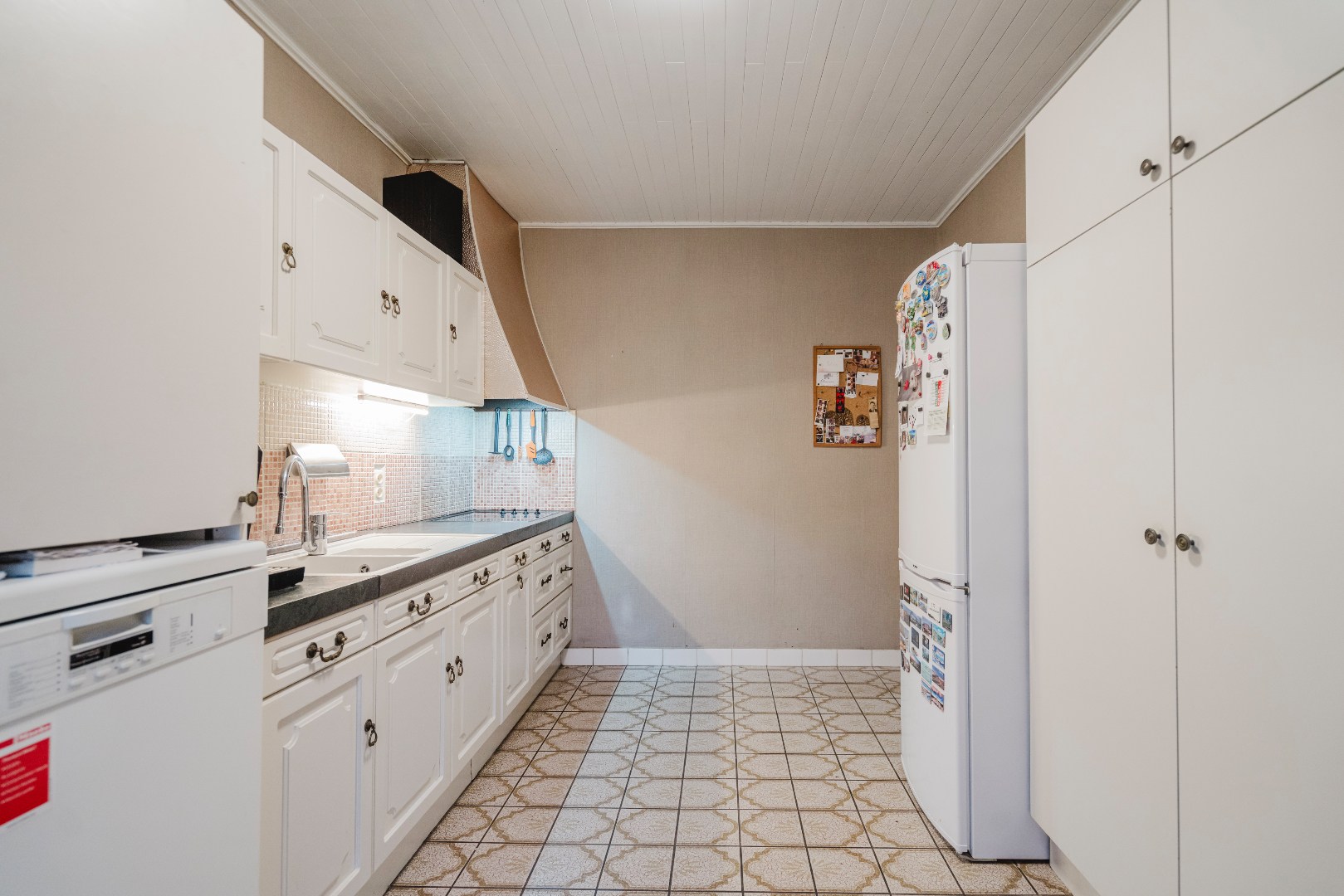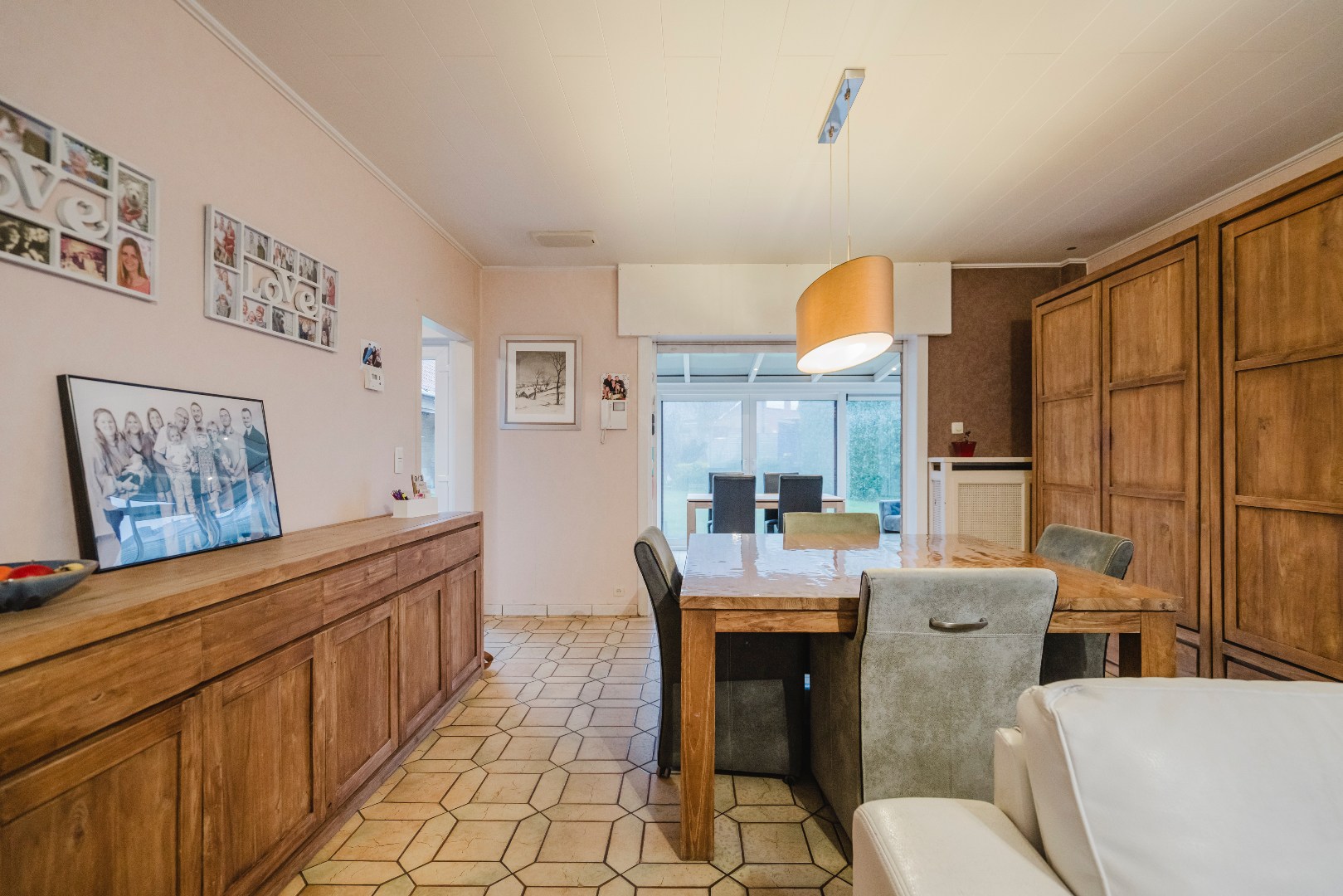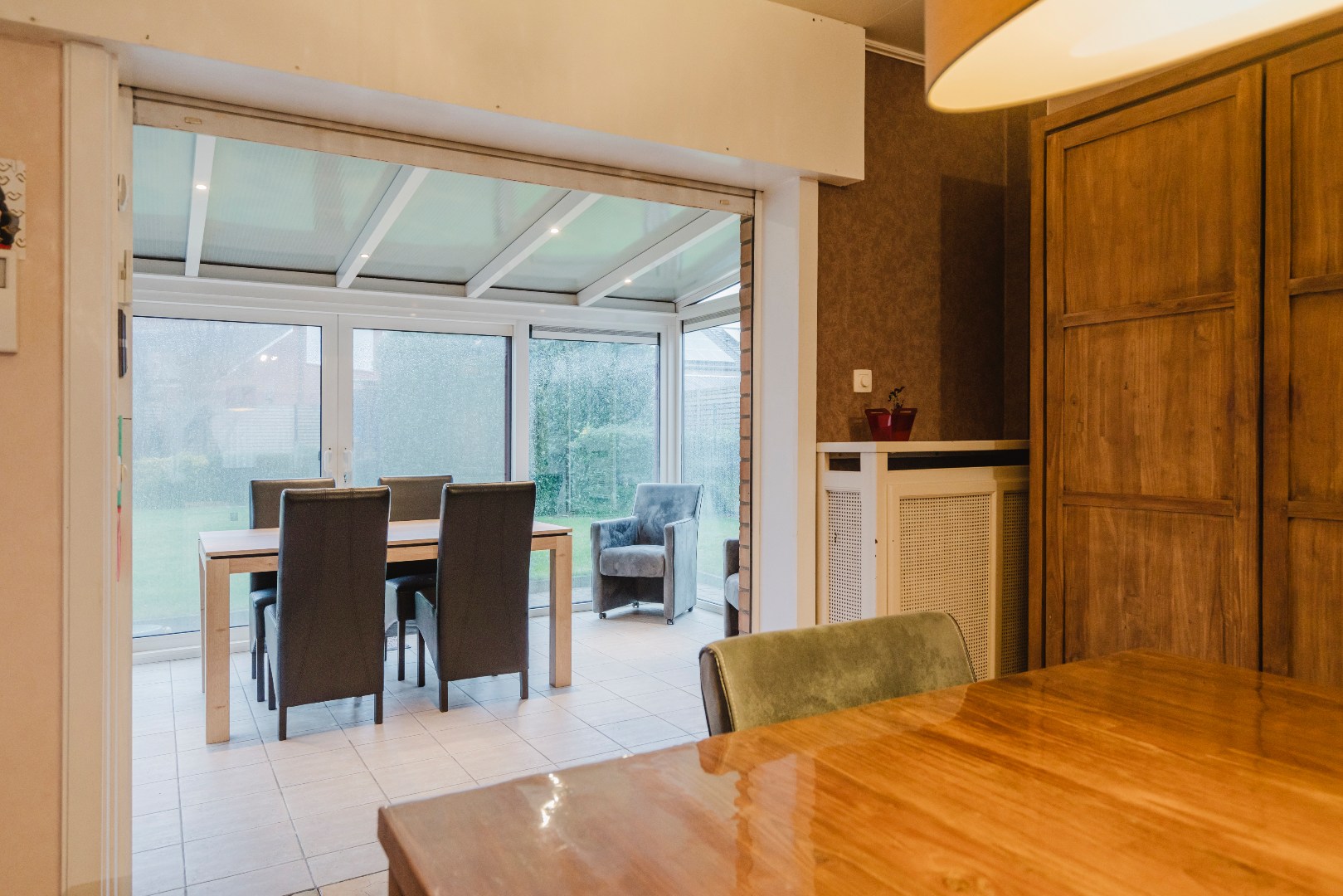 Via de inkomhal bereiken we het gastentoilet en de gezellige leefruimte met houtkachel, waar vele familiemomenten plaatsvonden. Aansluitend is er de afsluitbare veranda, een extra leefruimte om te genieten van de 1ste en laatste zon. De volledig uitgeruste keuken beschikt over een achterdeur met dierenluik.
