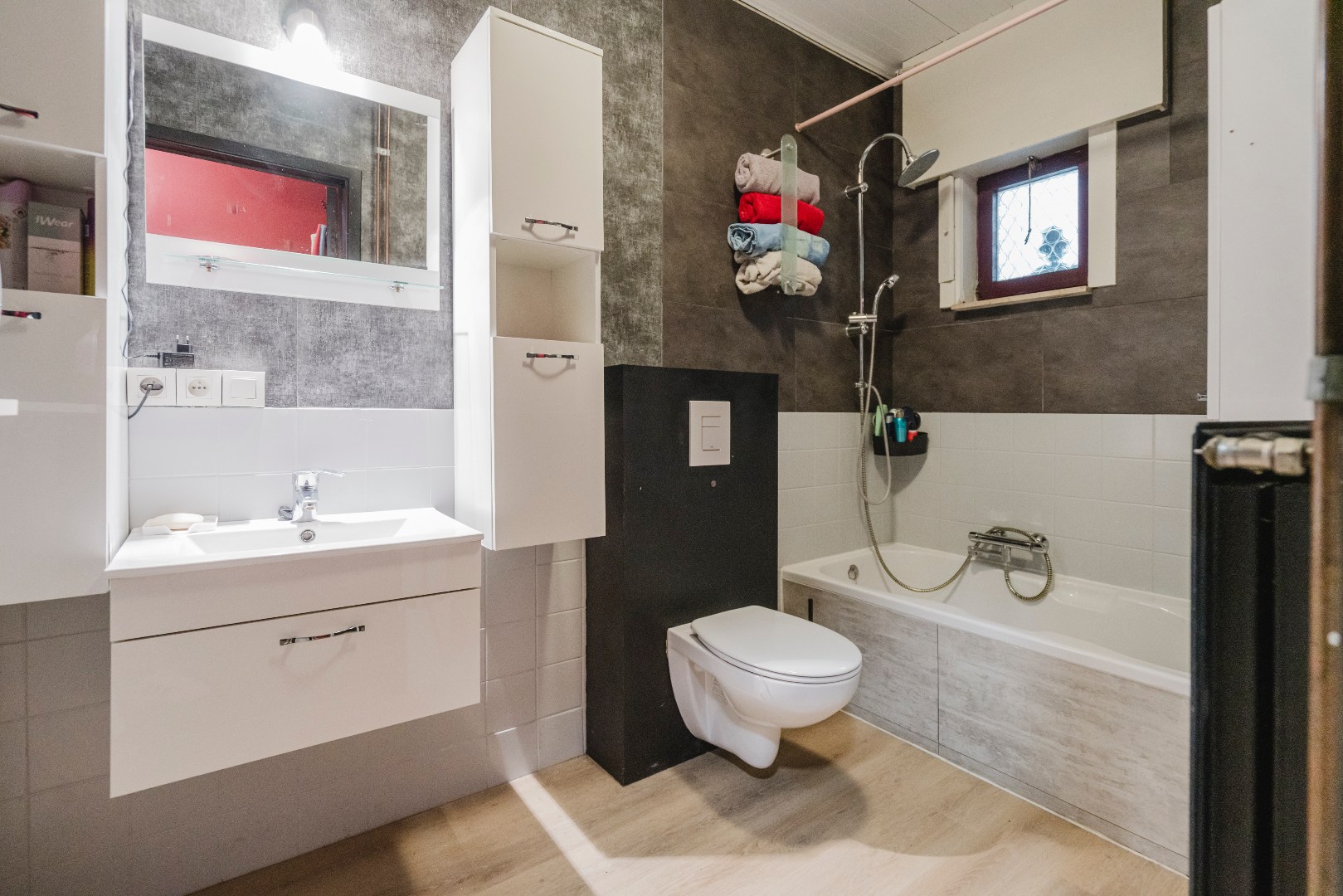 De nachthal, waar ook de technische voorzieningen zijn, geeft toegang tot 3 slaapkamers (één ruime en 2 kleinere), de badkamer met bad, lavabo, toilet & een bijkomende berging.