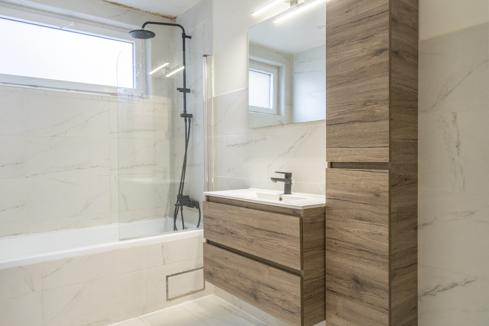 1ste verdiep: 2 ruime slaapkamers, waarvan één met mezanine, stijlvolle badkamer en toilet.