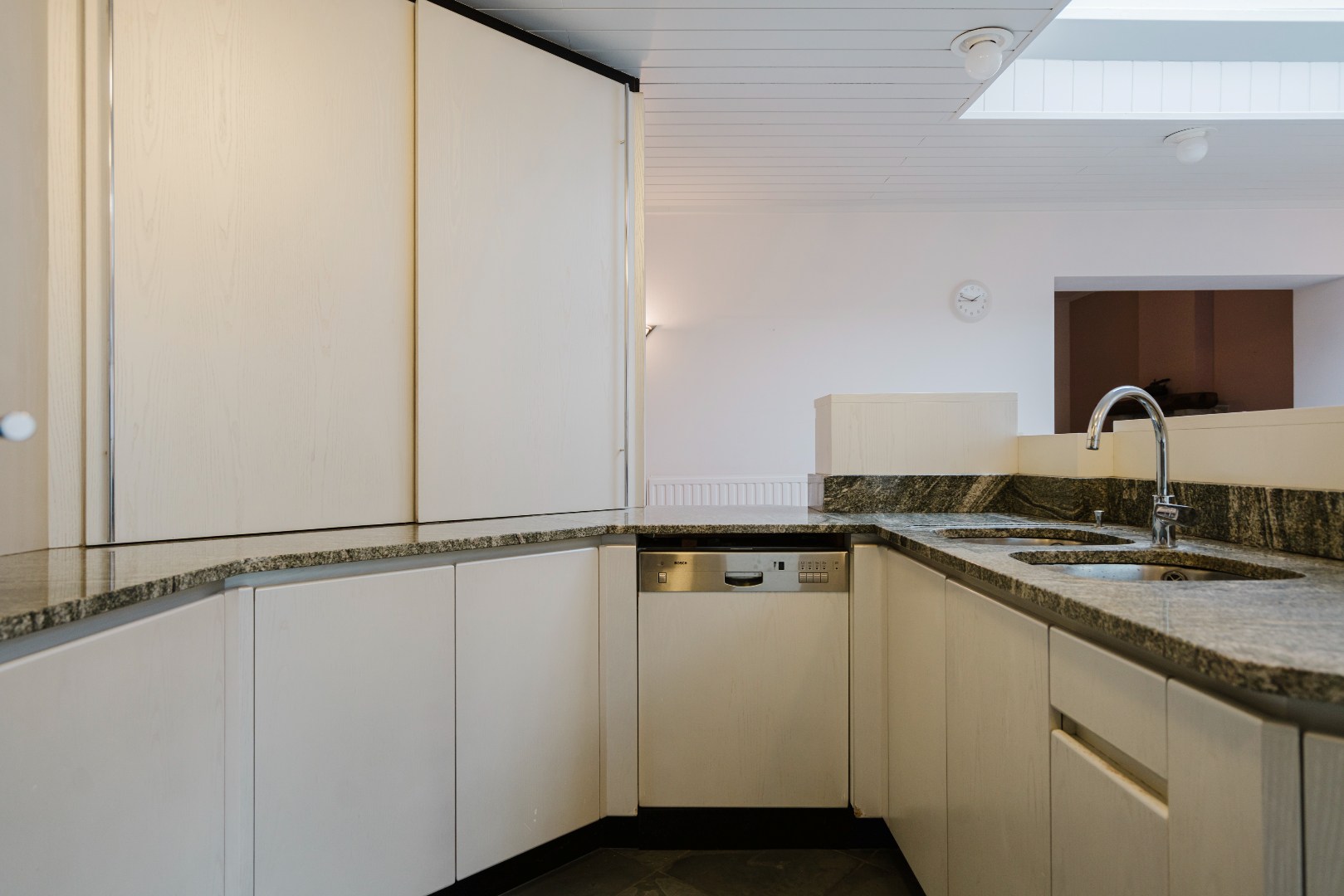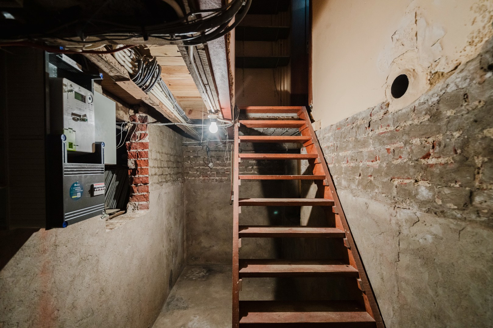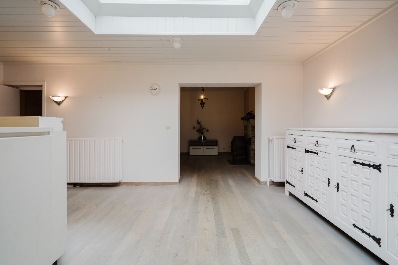 Het leefgedeelte bevindt zich achteraan en vormt een gezellig geheel met een knusse tv-hoek, een ruime eetplaats en een grote open keuken. De uitbouw met glazen plafond laat het daglicht royaal binnenstromen en zorgt voor een heerlijk gevoel van ruimte. Aan de achterzijde bevinden zich de badkamer en een praktische wasberging, terwijl je op het gelijkvloers ook een tweede toilet en de toegang tot zowel de kelder als de kruipkelder terugvindt.