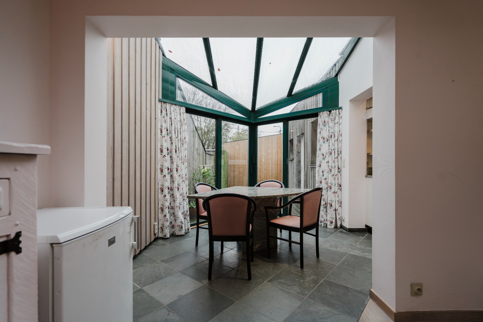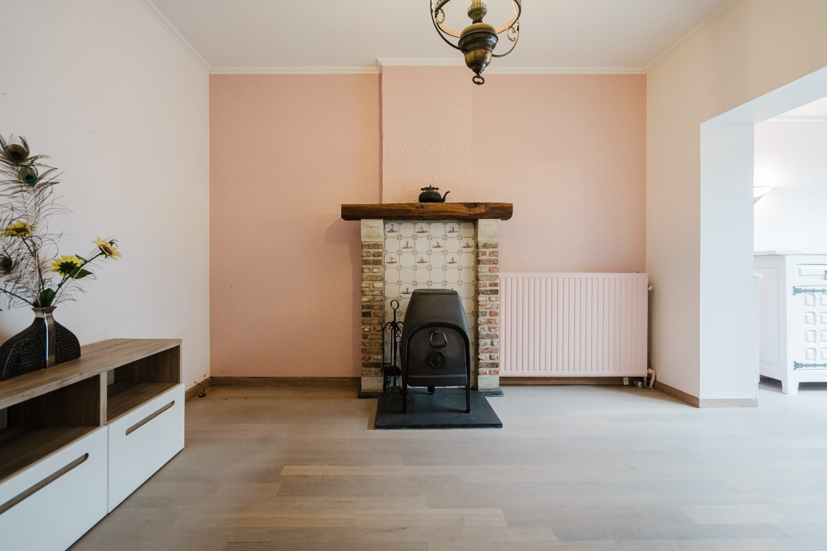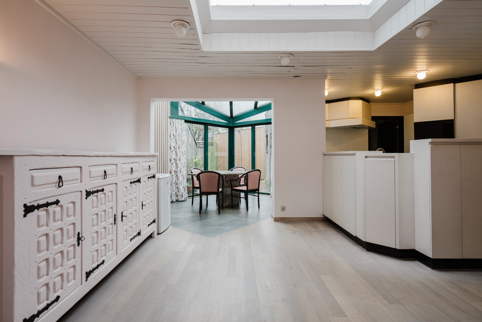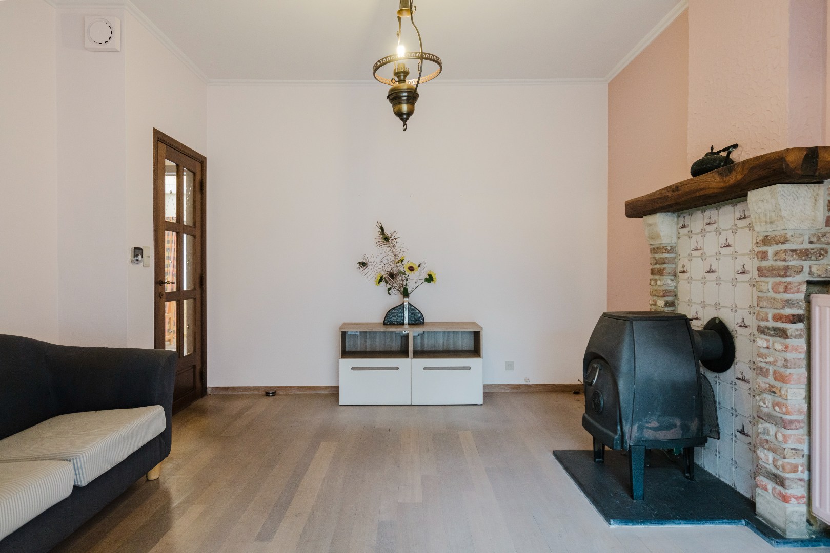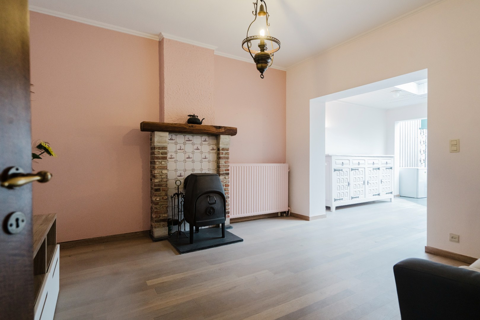 Aangename woning met een warm en uitnodigend karakter. Aan de voorzijde bevindt zich een polyvalente praktijkruimte waar de inkomhal, die tevens dienstdeed als wachtruimte, meteen een professionele maar toch huiselijke sfeer oproept. Het gastentoilet en het lichtrijke bureaugedeelte met ingemaakte kasten maken dit deel van de woning bijzonder geschikt voor wie wonen en werken harmonieus wil combineren.