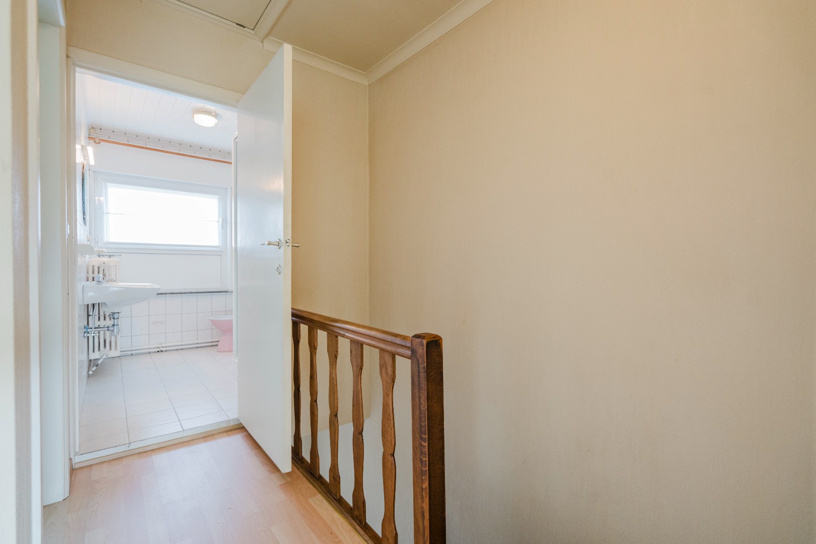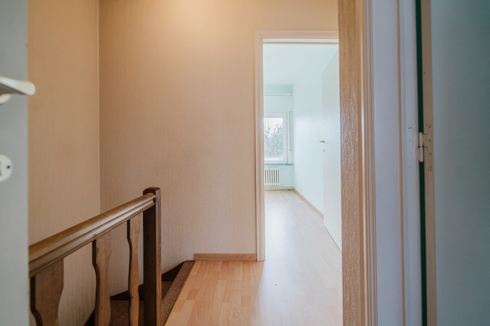 De stevige trap in de inkomhal leidt naar de bovenverdieping, waar zich drie volwaardige slaapkamers en een badkamer bevinden. Wie wenst, kan onder het dak nog extra kamers creëren. Deze ruimte leent zich hier ideaal toe en beschikt over een betonnen roostering.