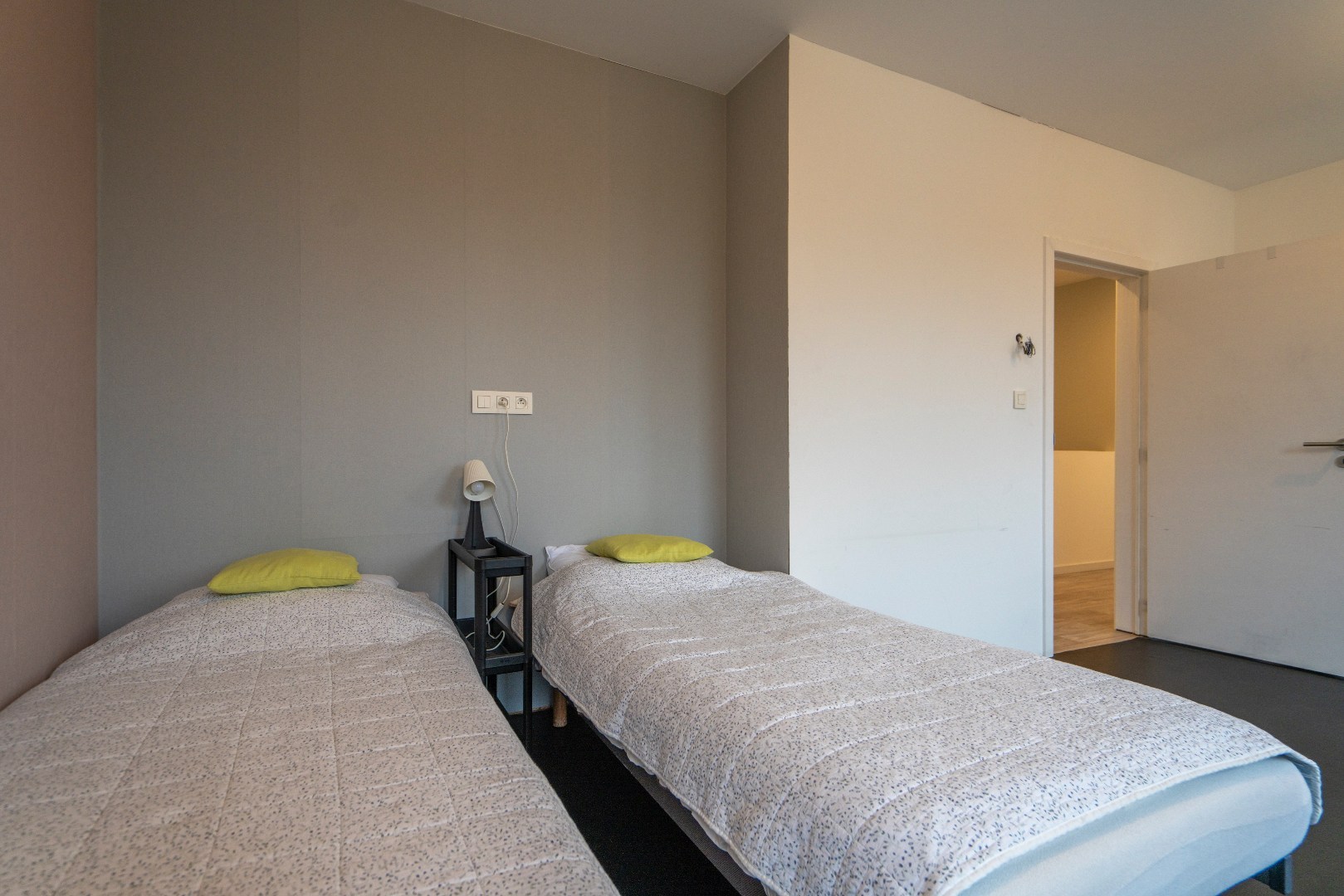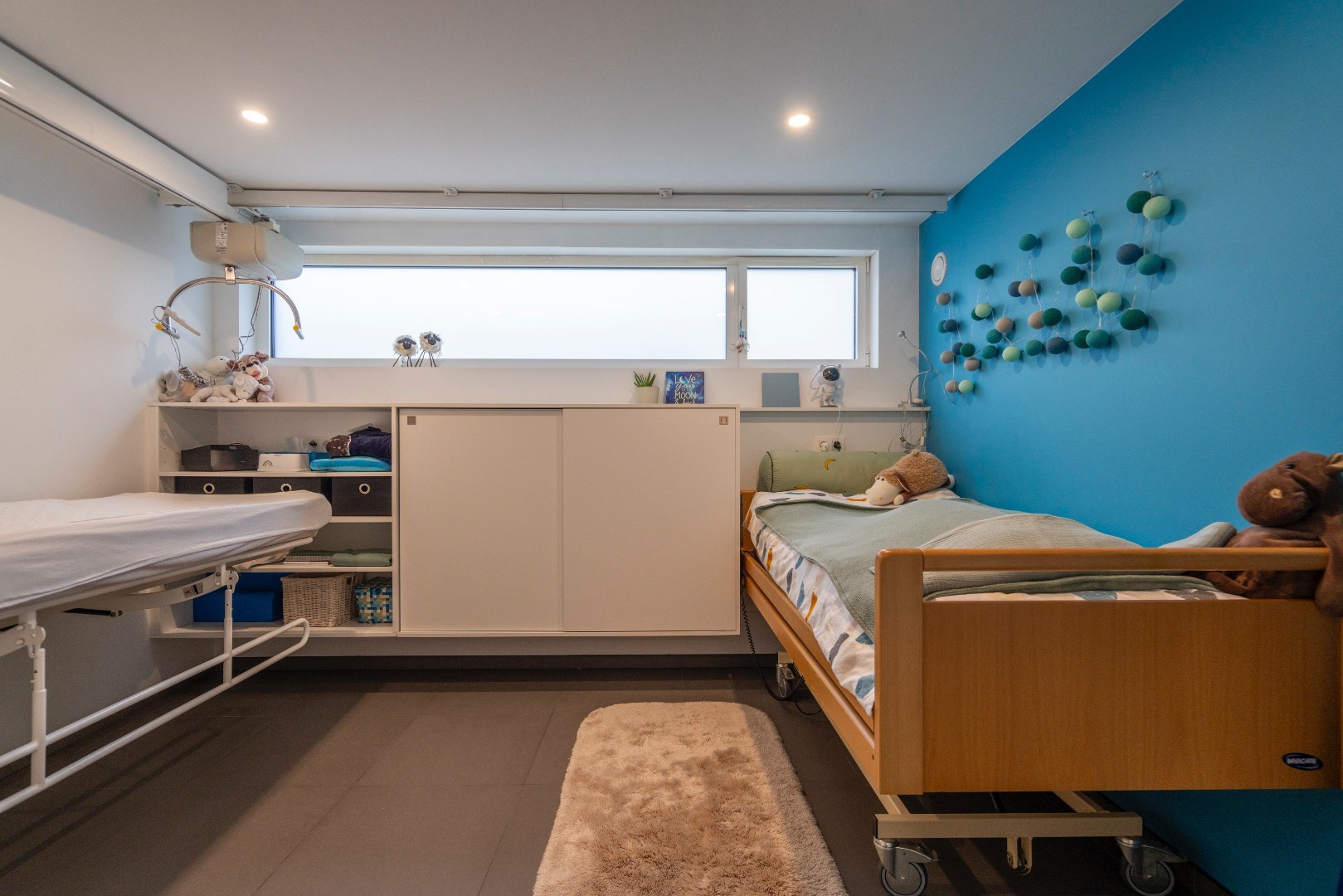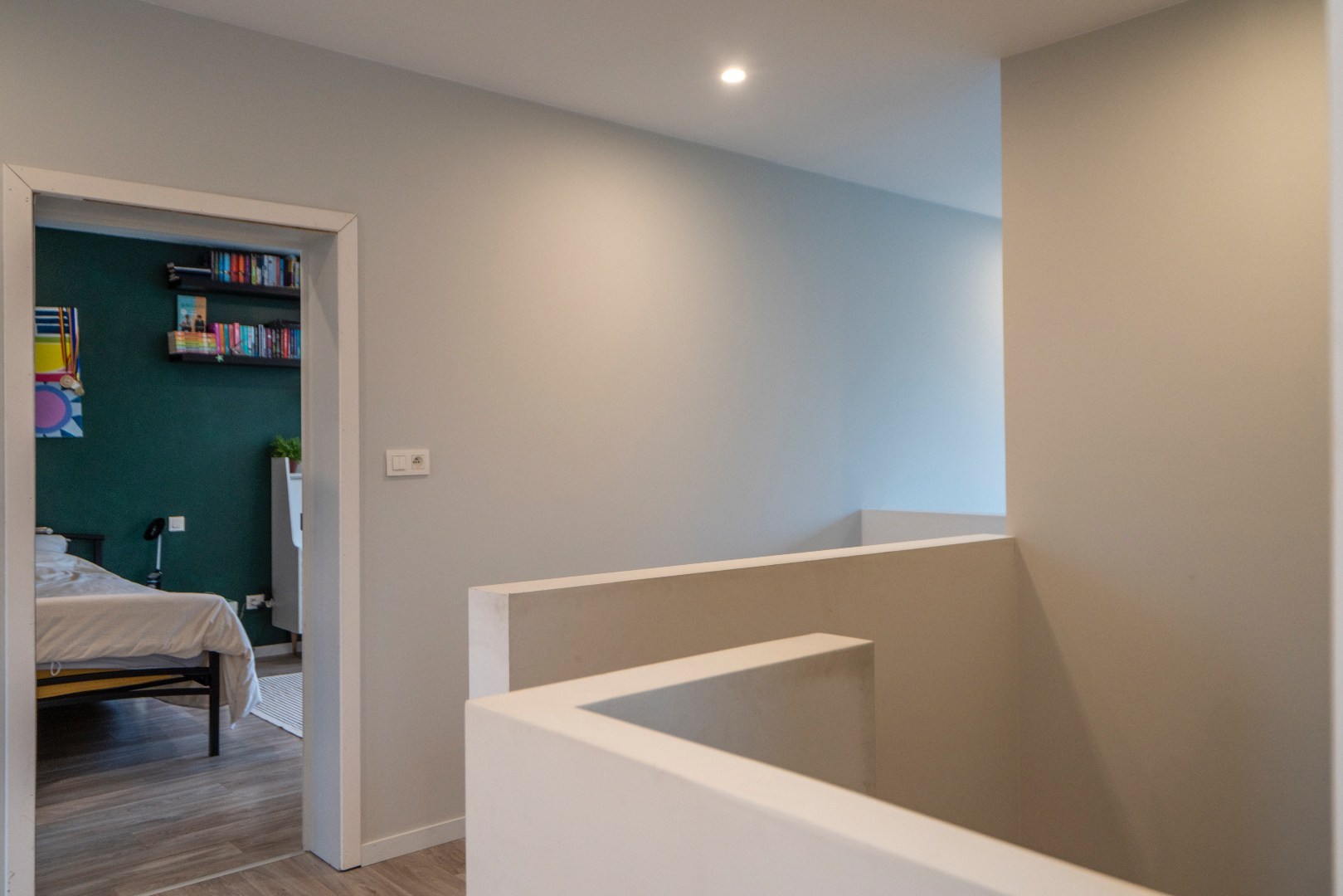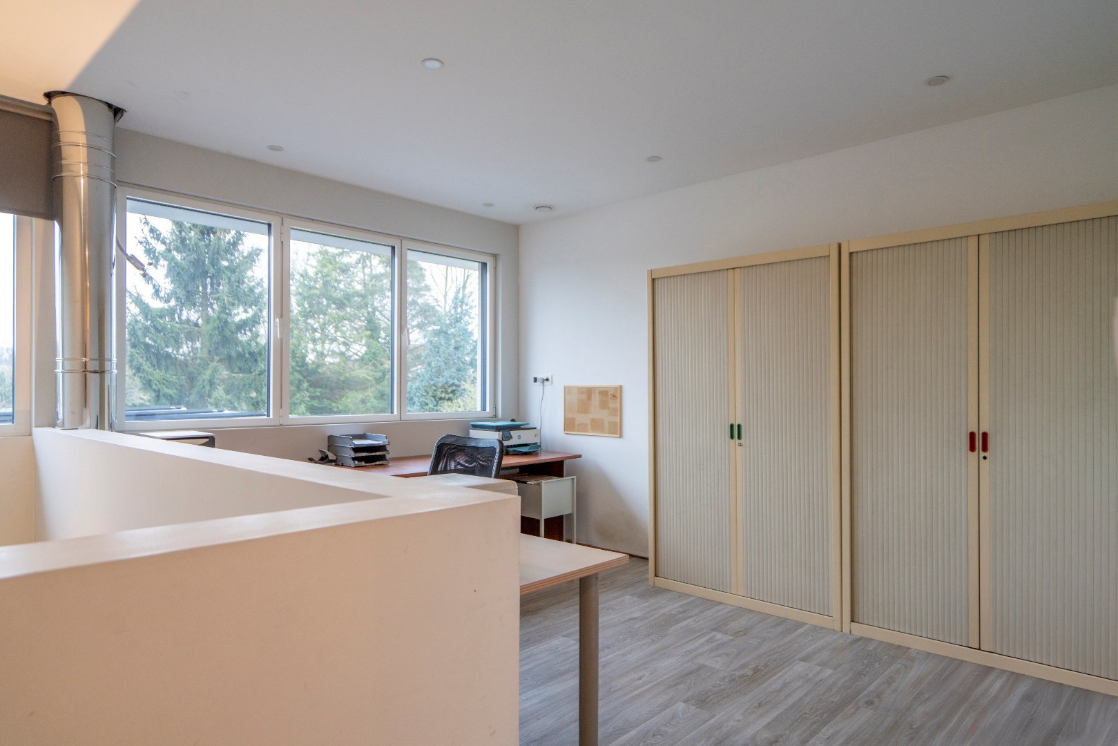 Op de bovenverdieping zijn er nog twee ruime slaapkamers (waarvan één met opfrishoek en lavabo) en een badkamer waar plaats voorzien is voor een infraroodcabine. Verder is er nog een apart toilet en een open bureauruimte die verbonden is met de rest van de woning. Deze kan eenvoudig worden afgesloten en ingericht als vijfde slaapkamer.