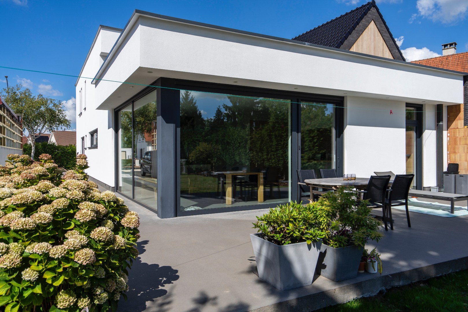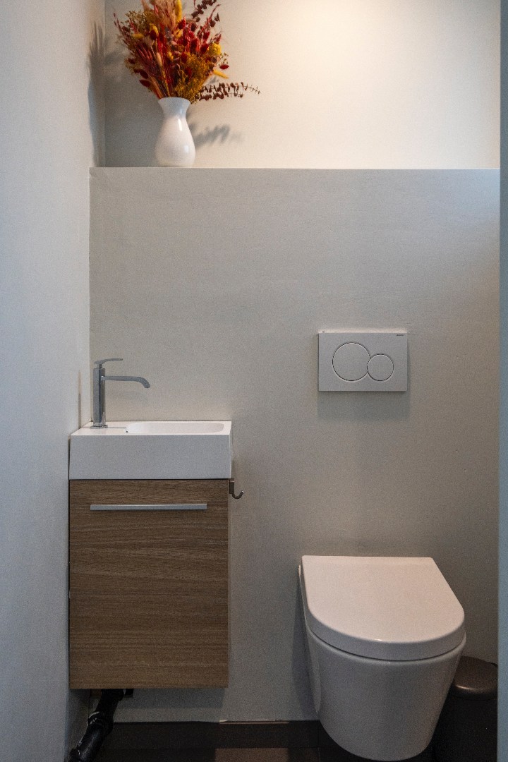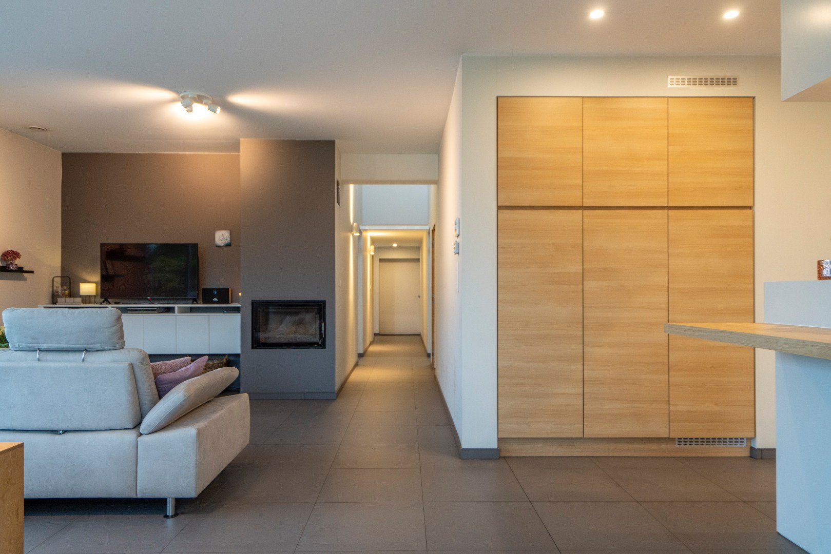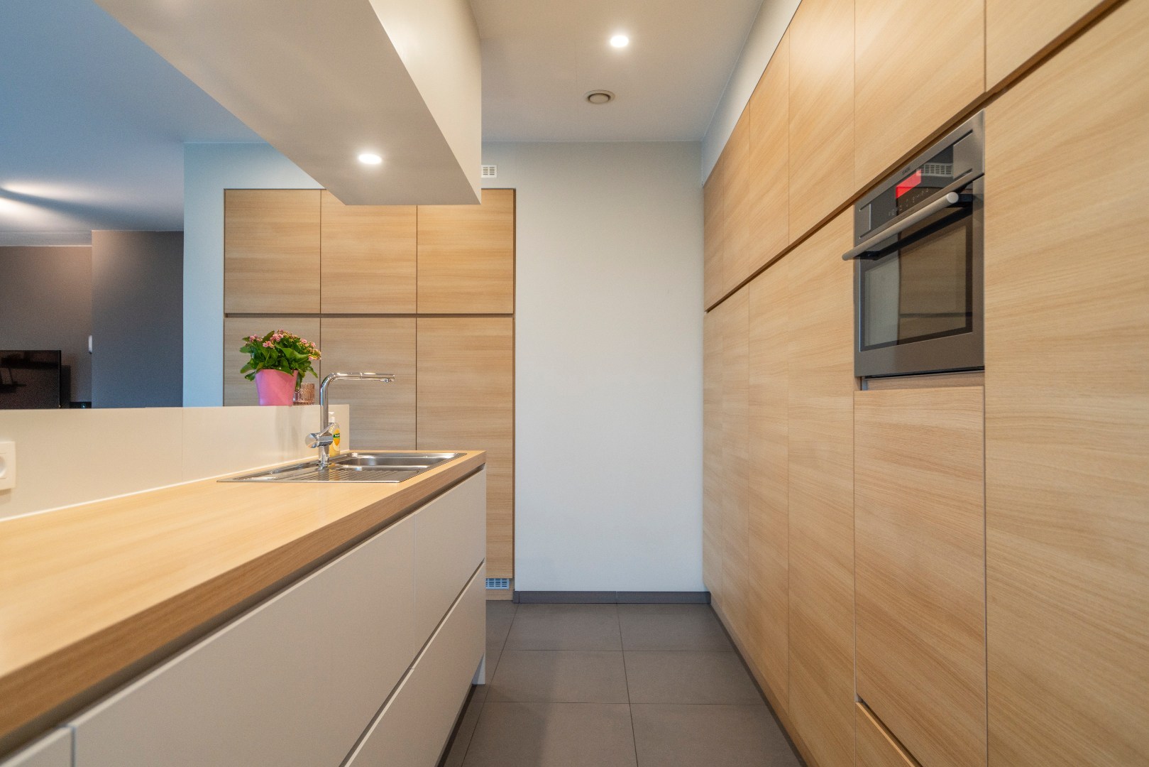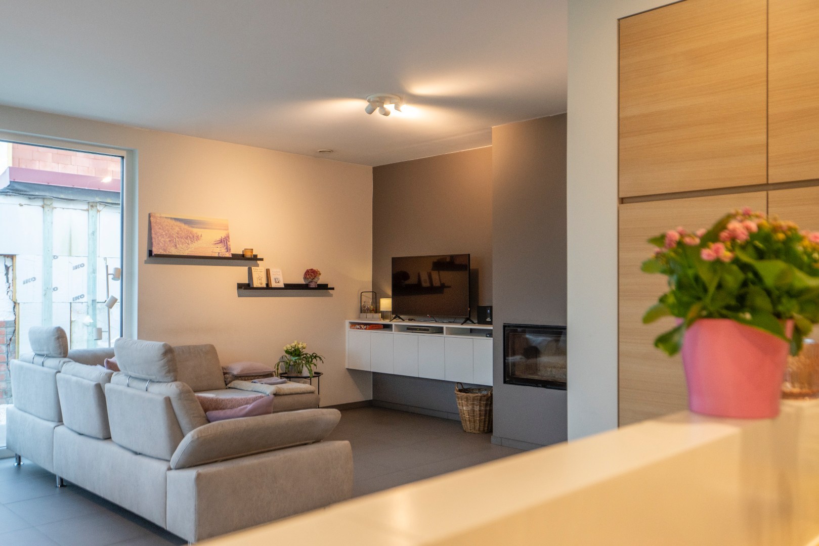 Aansluitend bevindt zich de keuken, uitgerust met alle nodige apparatuur en extra hoge kasten. Ideaal om rugklachten te vermijden & extra stockage. Vanuit de leefruimte of achterdeur wandel je rechtstreeks naar het terras in poliebeton met zicht op de tuin, het tuinhuis en de gezellige overdekte chillzone.