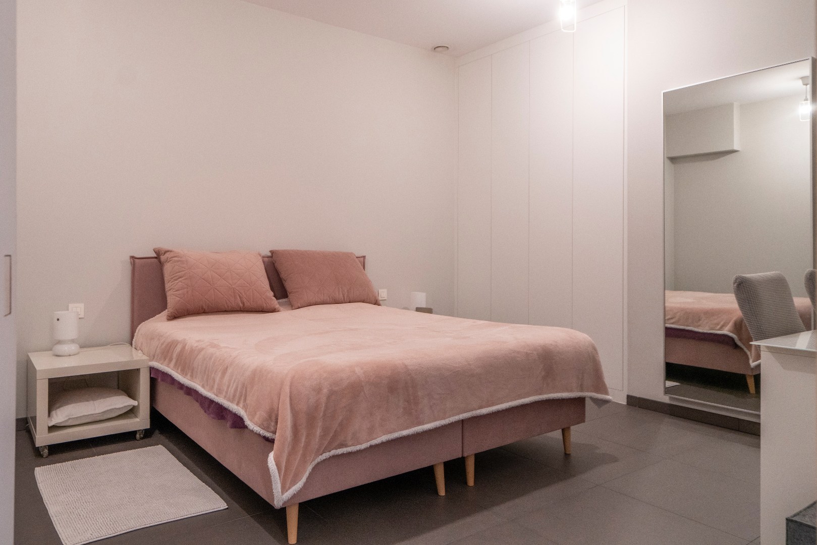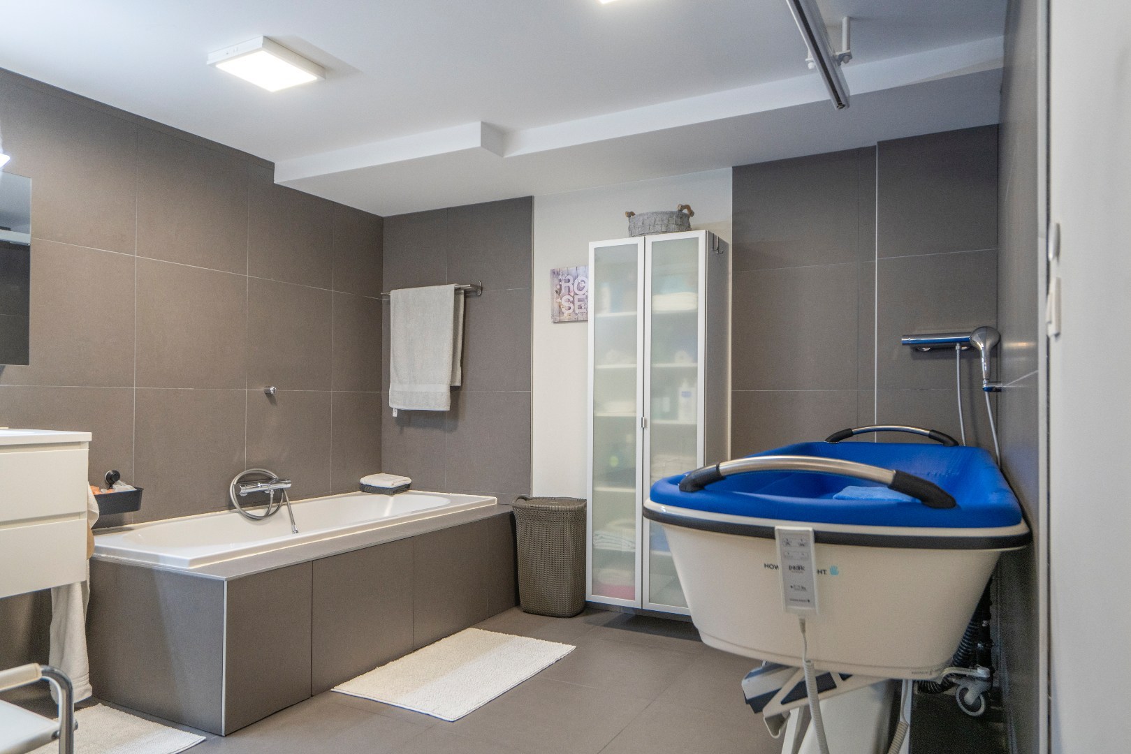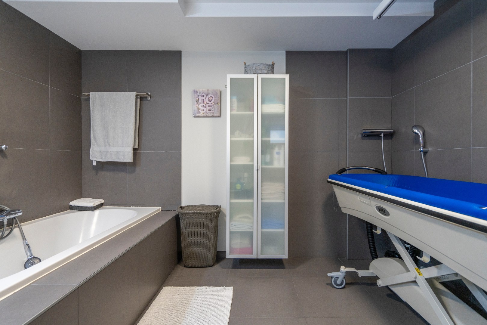 Op het gelijkvloers zijn er twee slaapkamers met ingemaakte kasten en een badkamer met dubbel lavabomeubel, ligbad en voorzieningen voor een inloopdouche.