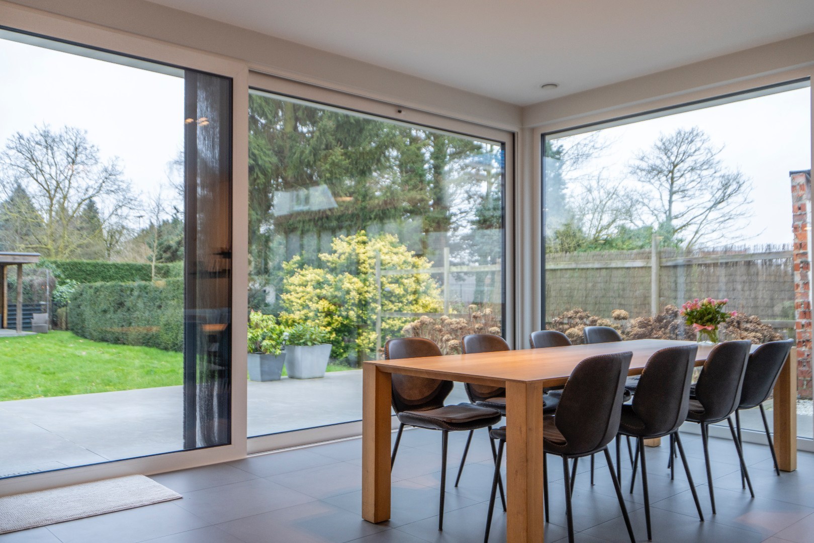 Achteraan ligt de lichtrijke eet-en zithoek met houtkachel, elektrische screens en grote glaspartijen.
