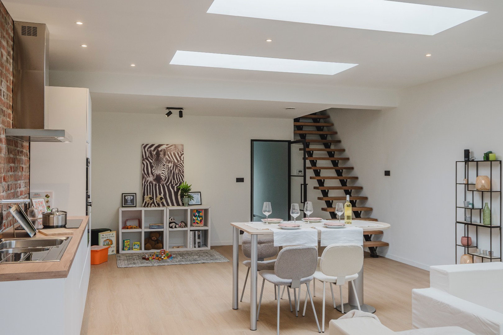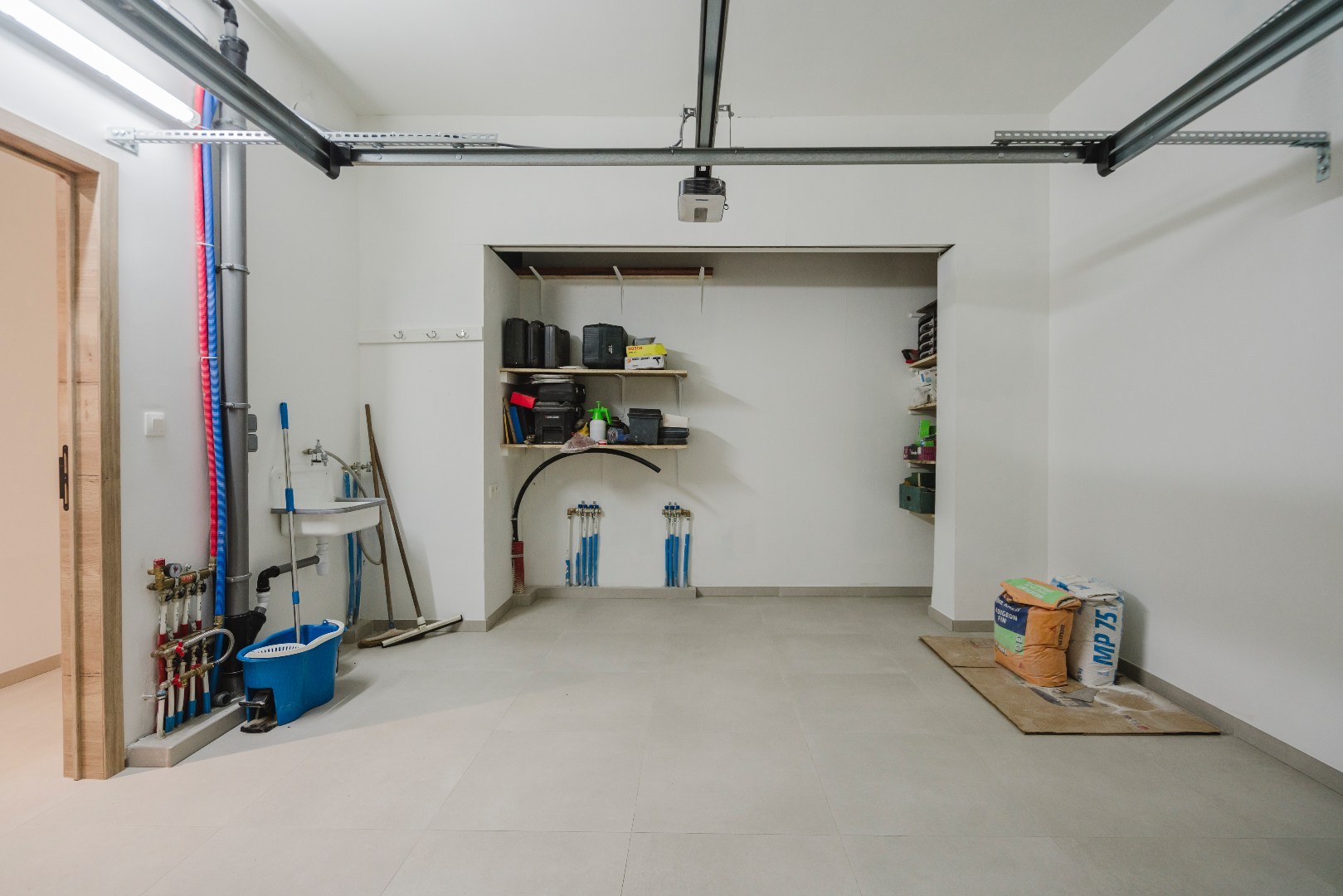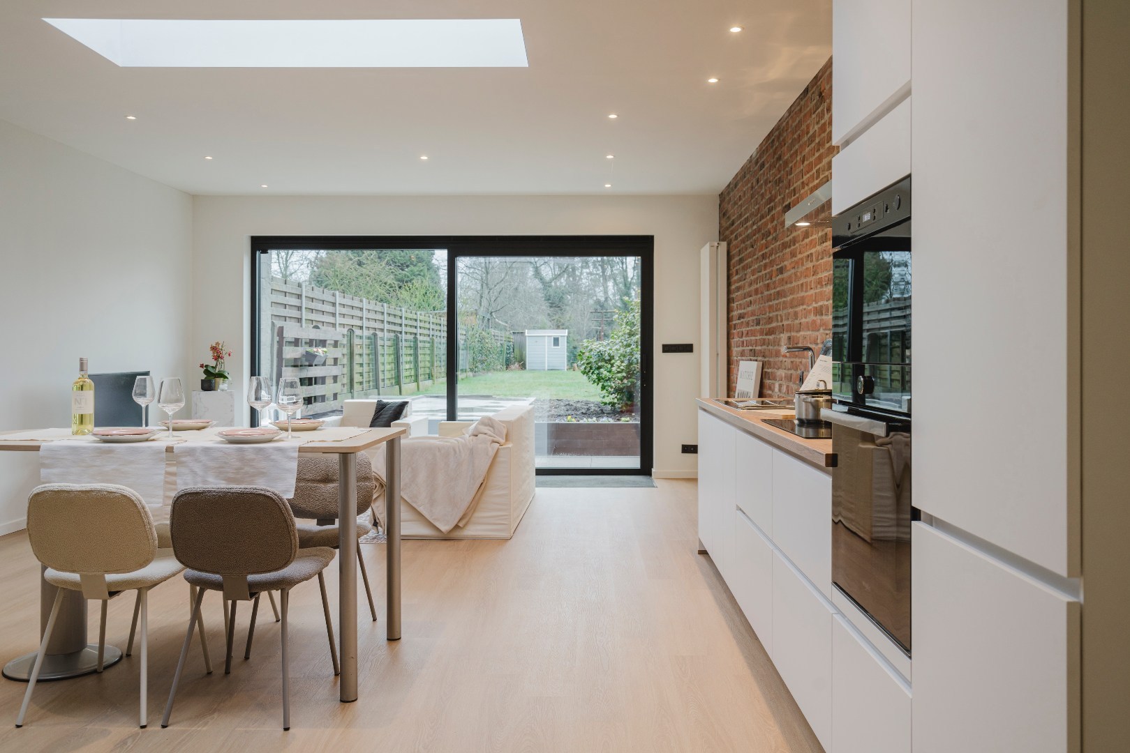 De inkomgang met apart gastentoilet geeft toegang tot de ruime garage met wasberging. Via een steellook-deur kom je in een lichtrijke leefruimte, dankzij koepels en schuifraam, met open keuken voorzien van alle nodige toestellen.