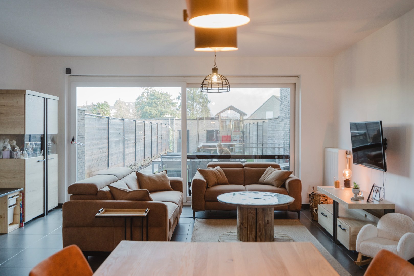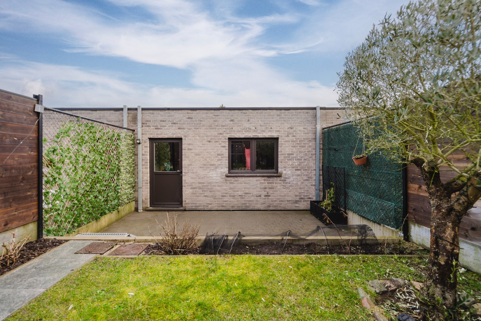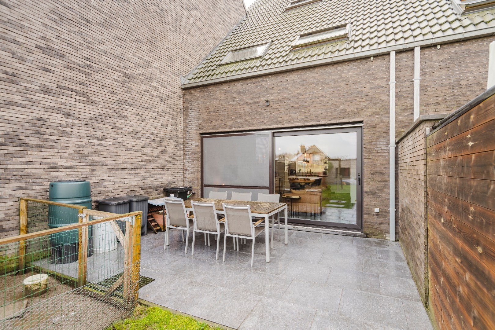Via het schuifraam (met vliegraam) bereiken we de tuin voorzien van 2 terrassen. Zo kan je steeds kiezen tussen zon en schaduw. Extra troeven: regenput, ruime dubbele garage met uitweg op een private weg met gastenparking en speelruimte. Ideaal voor (groeiende) gezinnen!