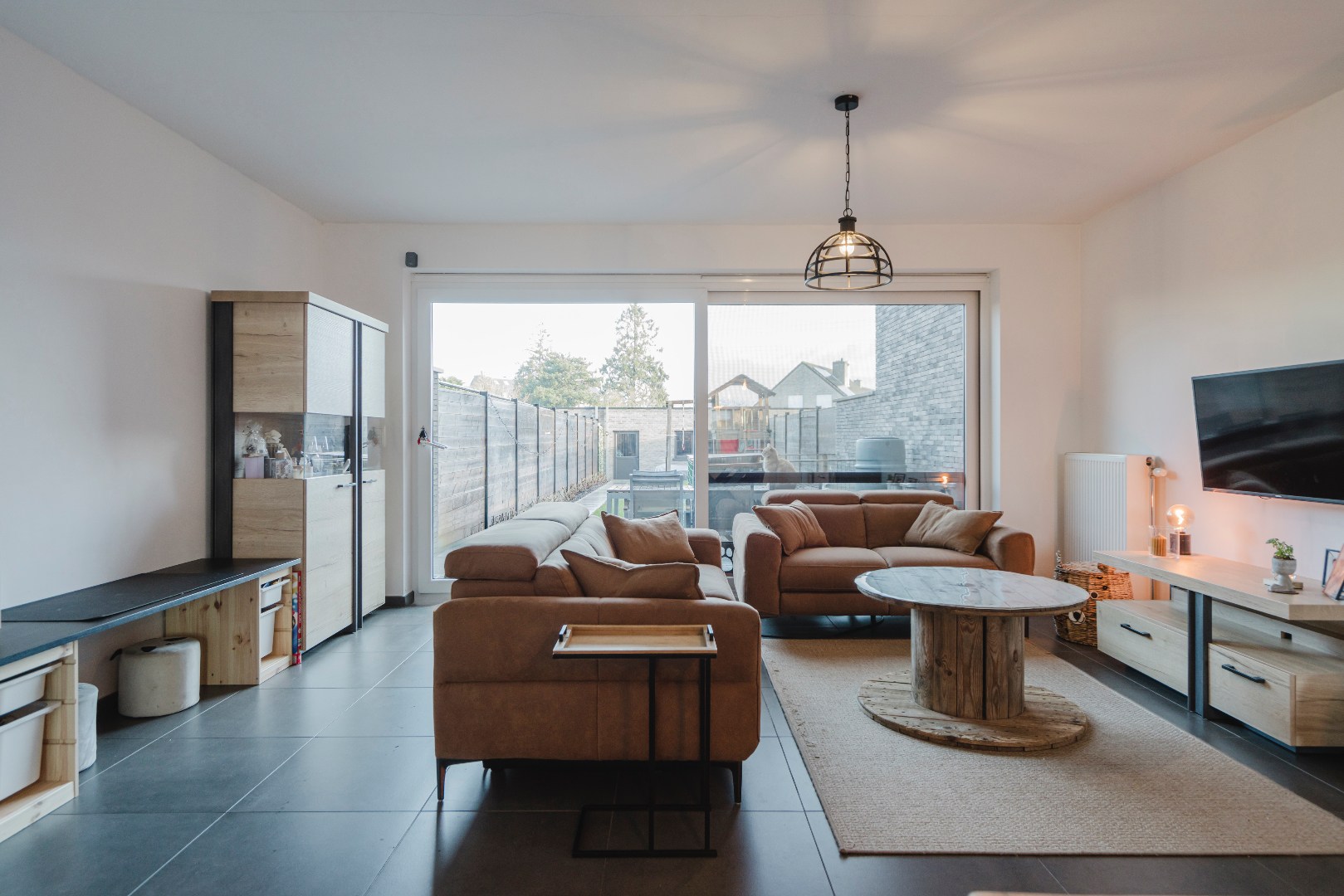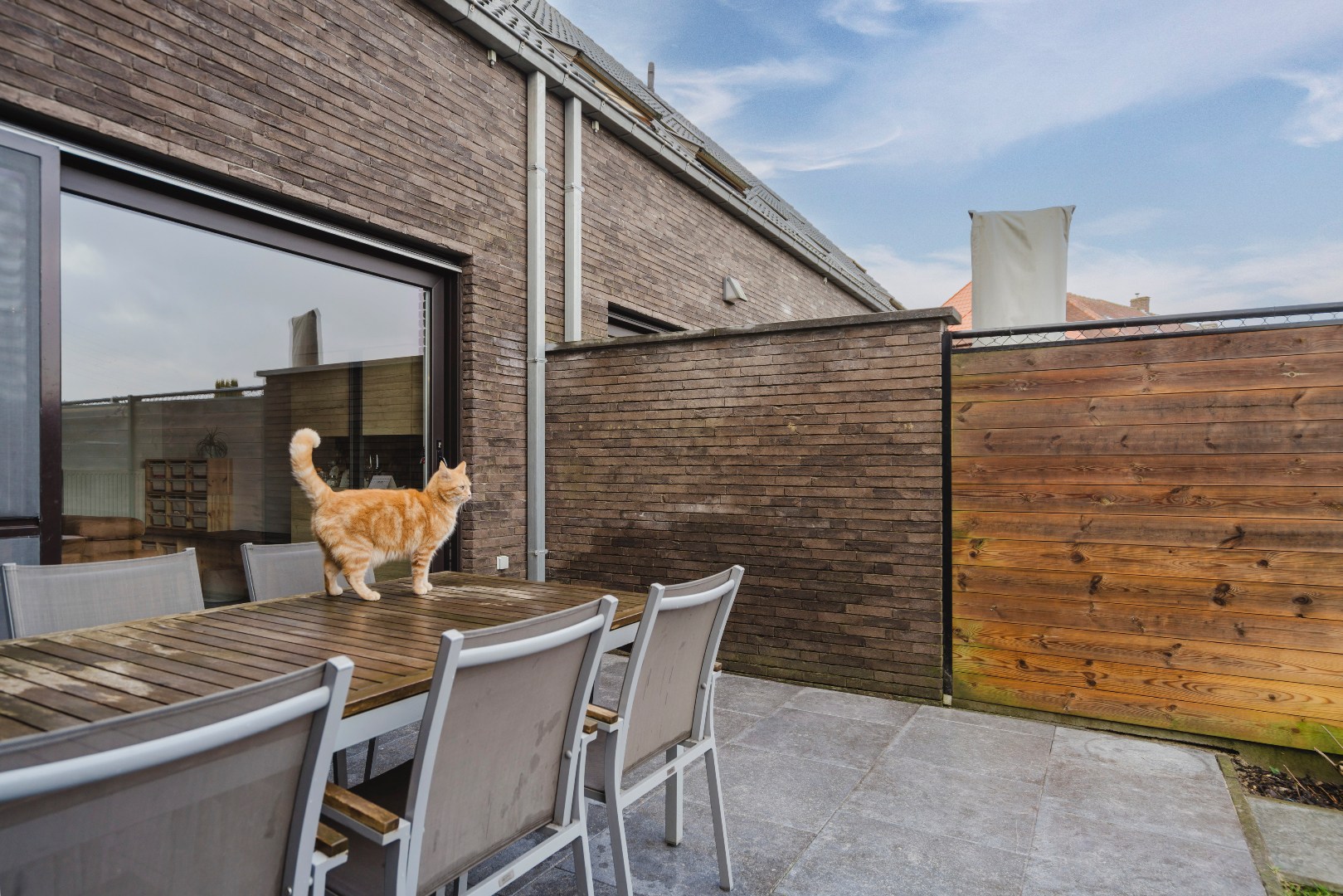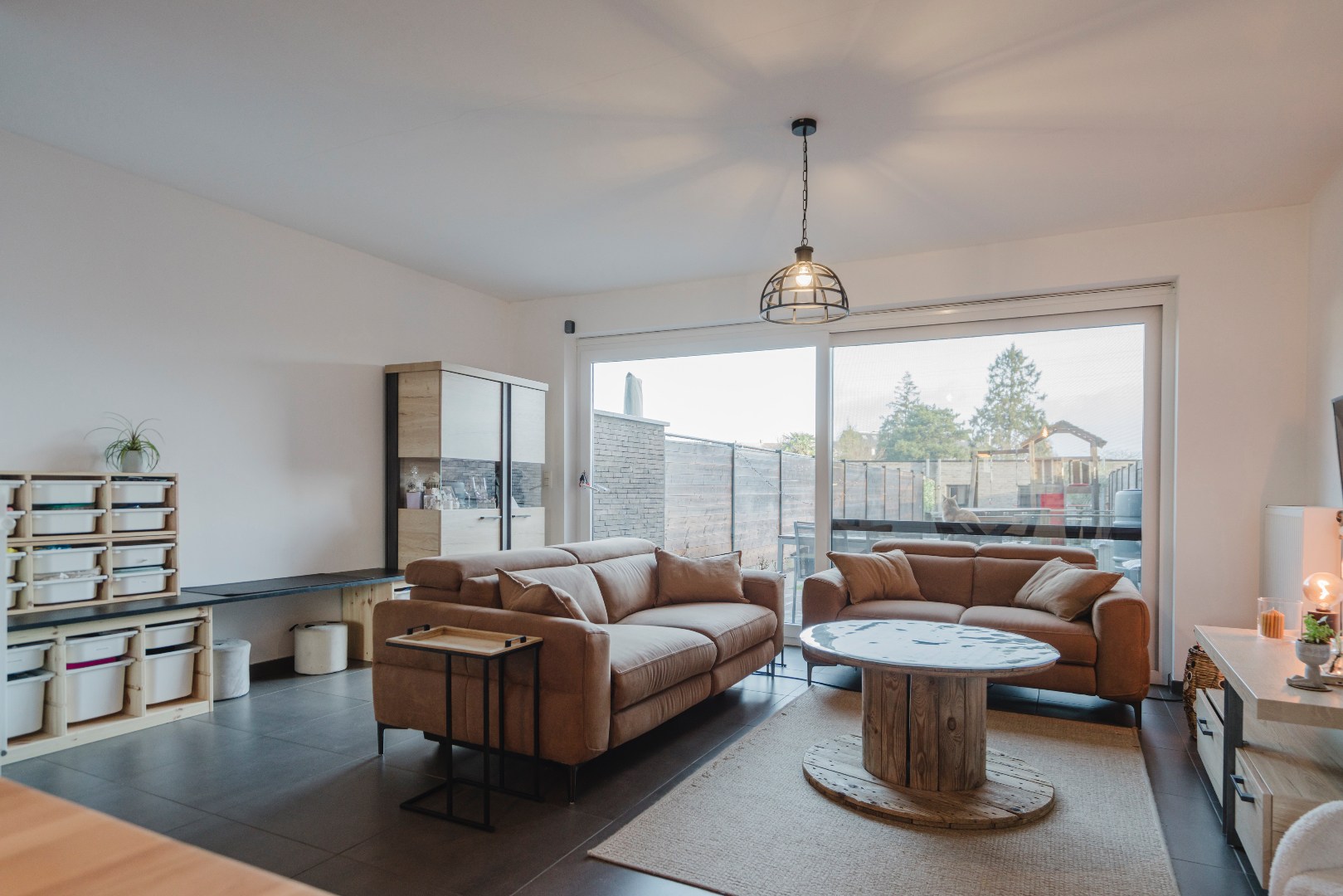 Via het schuifraam (met vliegraam) bereiken we de tuin voorzien van 2 terrassen. Zo kan je steeds kiezen tussen zon en schaduw. Extra troeven: regenput, ruime dubbele garage met uitweg op een private weg met gastenparking en speelruimte. Ideaal voor (groeiende) gezinnen!