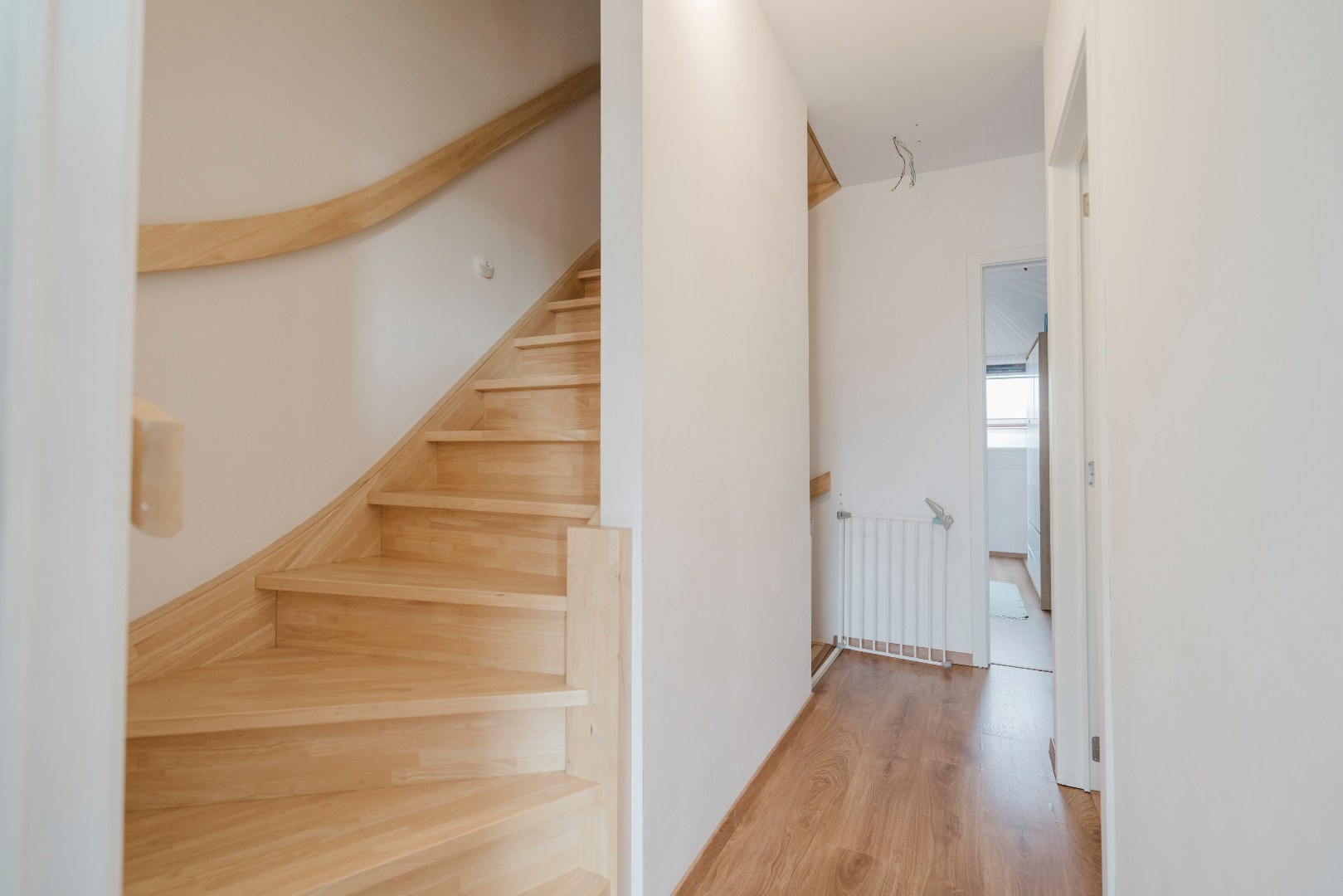 Beneden: inkomhal met vestiaireruimte en gastentoilet. De open leefruimte met uitgeruste keuken en ruimte voor een bureau/speelhoek. 2 praktische bergingen voor alle technieken & meer. Een steel-lookdeur leidt naar de trap.